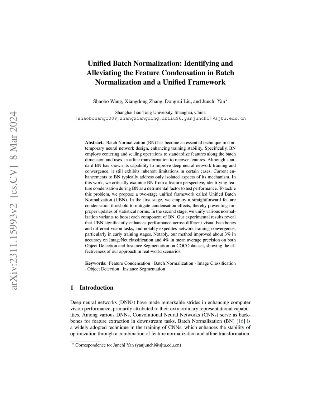 Batch Normalization (BN) has become an essential technique in contemporary neural network design, enhancing training stability. Specifically, BN employs centering and scaling operations to standardize features along the batch dimension and uses an affine transformation to recover features. Although standard BN has shown its capability to improve deep neural network training and convergence, it still exhibits inherent limitations in certain cases. Current enhancements to BN typically address only isolated aspects of its mechanism. In this work, we critically examine BN from a feature perspective, identifying feature condensation during BN as a detrimental factor to test performance. To tackle this problem, we propose a two-stage unified framework called Unified Batch Normalization (UBN). In the first stage, we employ a straightforward feature condensation threshold to mitigate condensation effects, thereby preventing improper updates of statistical norms. In the second stage, we unify various normalization variants to boost each component of BN. Our experimental results reveal that UBN significantly enhances performance across different visual backbones and different vision tasks, and notably expedites network training convergence, particularly in early training stages. Notably, our method improved about 3% in accuracy on ImageNet classification and 4% in mean average precision on both Object Detection and Instance Segmentation on COCO dataset, showing the effectiveness of our approach in real-world scenarios.