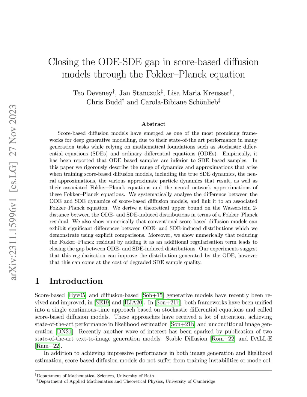Score-based diffusion models have emerged as one of the most promising frameworks for deep generative modelling, due to their state-of-the art performance in many generation tasks while relying on mathematical foundations such as stochastic differential equations (SDEs) and ordinary differential equations (ODEs). Empirically, it has been reported that ODE based samples are inferior to SDE based samples. In this paper we rigorously describe the range of dynamics and approximations that arise when training score-based diffusion models, including the true SDE dynamics, the neural approximations, the various approximate particle dynamics that result, as well as their associated Fokker--Planck equations and the neural network approximations of these Fokker--Planck equations. We systematically analyse the difference between the ODE and SDE dynamics of score-based diffusion models, and link it to an associated Fokker--Planck equation. We derive a theoretical upper bound on the Wasserstein 2-distance between the ODE- and SDE-induced distributions in terms of a Fokker--Planck residual. We also show numerically that conventional score-based diffusion models can exhibit significant differences between ODE- and SDE-induced distributions which we demonstrate using explicit comparisons. Moreover, we show numerically that reducing the Fokker--Planck residual by adding it as an additional regularisation term leads to closing the gap between ODE- and SDE-induced distributions. Our experiments suggest that this regularisation can improve the distribution generated by the ODE, however that this can come at the cost of degraded SDE sample quality.