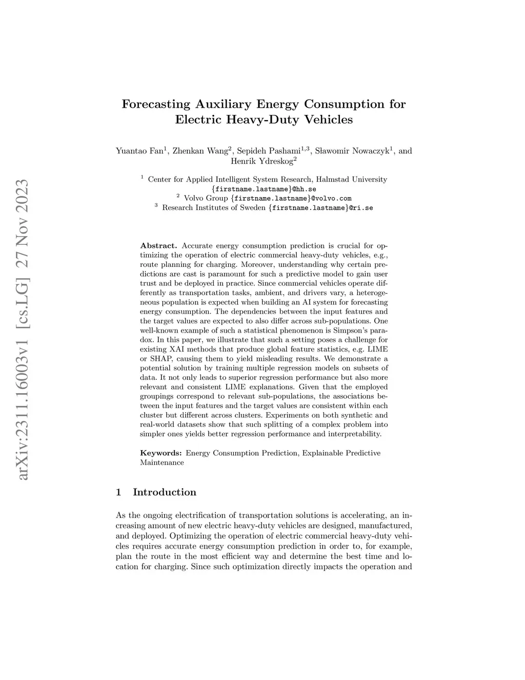 Accurate energy consumption prediction is crucial for optimizing the operation of electric commercial heavy-duty vehicles, e.g., route planning for charging. Moreover, understanding why certain predictions are cast is paramount for such a predictive model to gain user trust and be deployed in practice. Since commercial vehicles operate differently as transportation tasks, ambient, and drivers vary, a heterogeneous population is expected when building an AI system for forecasting energy consumption. The dependencies between the input features and the target values are expected to also differ across sub-populations. One well-known example of such a statistical phenomenon is the Simpson paradox. In this paper, we illustrate that such a setting poses a challenge for existing XAI methods that produce global feature statistics, e.g. LIME or SHAP, causing them to yield misleading results. We demonstrate a potential solution by training multiple regression models on subsets of data. It not only leads to superior regression performance but also more relevant and consistent LIME explanations. Given that the employed groupings correspond to relevant sub-populations, the associations between the input features and the target values are consistent within each cluster but different across clusters. Experiments on both synthetic and real-world datasets show that such splitting of a complex problem into simpler ones yields better regression performance and interpretability.