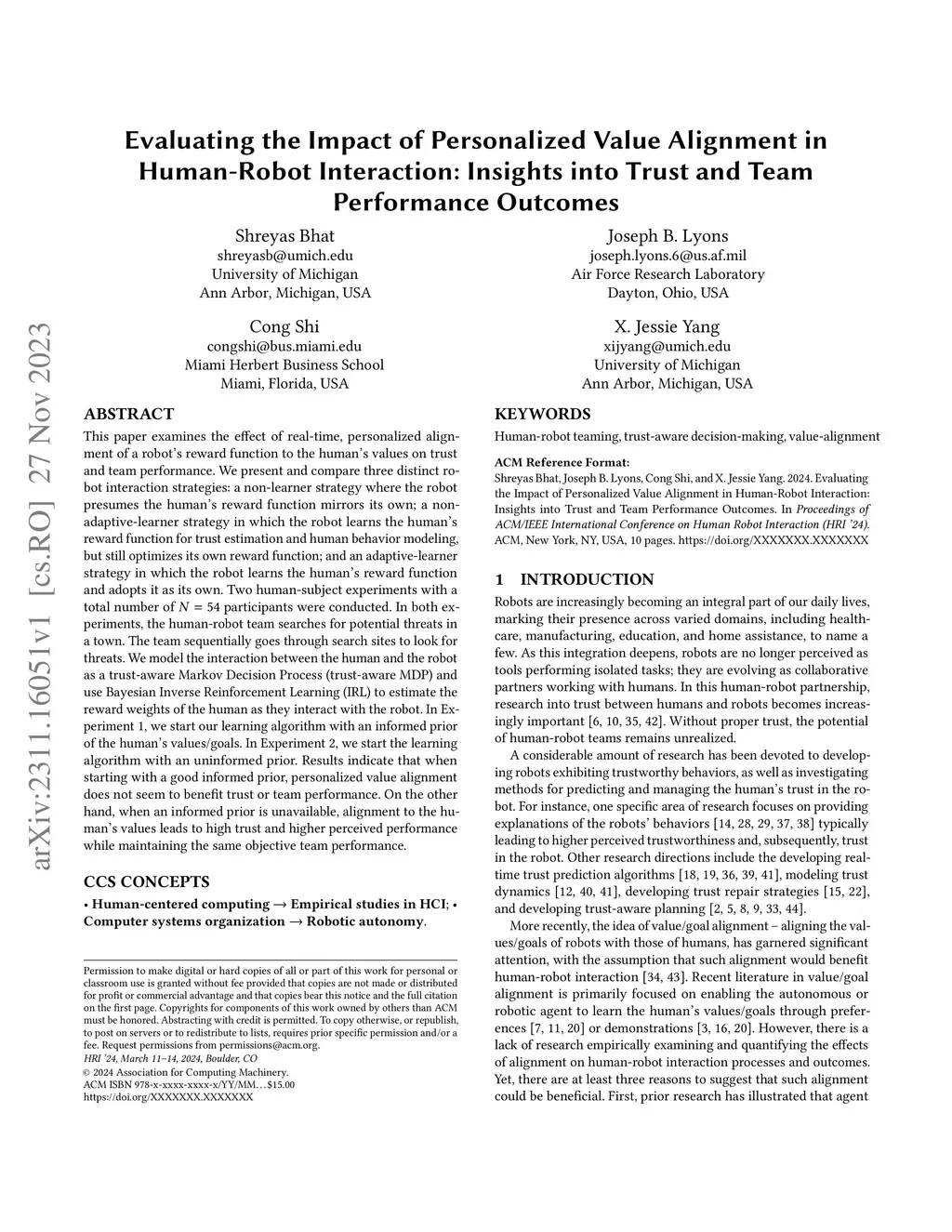 This paper examines the effect of real-time, personalized alignment of a robot's reward function to the human's values on trust and team performance. We present and compare three distinct robot interaction strategies: a non-learner strategy where the robot presumes the human's reward function mirrors its own, a non-adaptive-learner strategy in which the robot learns the human's reward function for trust estimation and human behavior modeling, but still optimizes its own reward function, and an adaptive-learner strategy in which the robot learns the human's reward function and adopts it as its own. Two human-subject experiments with a total number of 54 participants were conducted. In both experiments, the human-robot team searches for potential threats in a town. The team sequentially goes through search sites to look for threats. We model the interaction between the human and the robot as a trust-aware Markov Decision Process (trust-aware MDP) and use Bayesian Inverse Reinforcement Learning (IRL) to estimate the reward weights of the human as they interact with the robot. In Experiment 1, we start our learning algorithm with an informed prior of the human's values/goals. In Experiment 2, we start the learning algorithm with an uninformed prior. Results indicate that when starting with a good informed prior, personalized value alignment does not seem to benefit trust or team performance. On the other hand, when an informed prior is unavailable, alignment to the human's values leads to high trust and higher perceived performance while maintaining the same objective team performance.