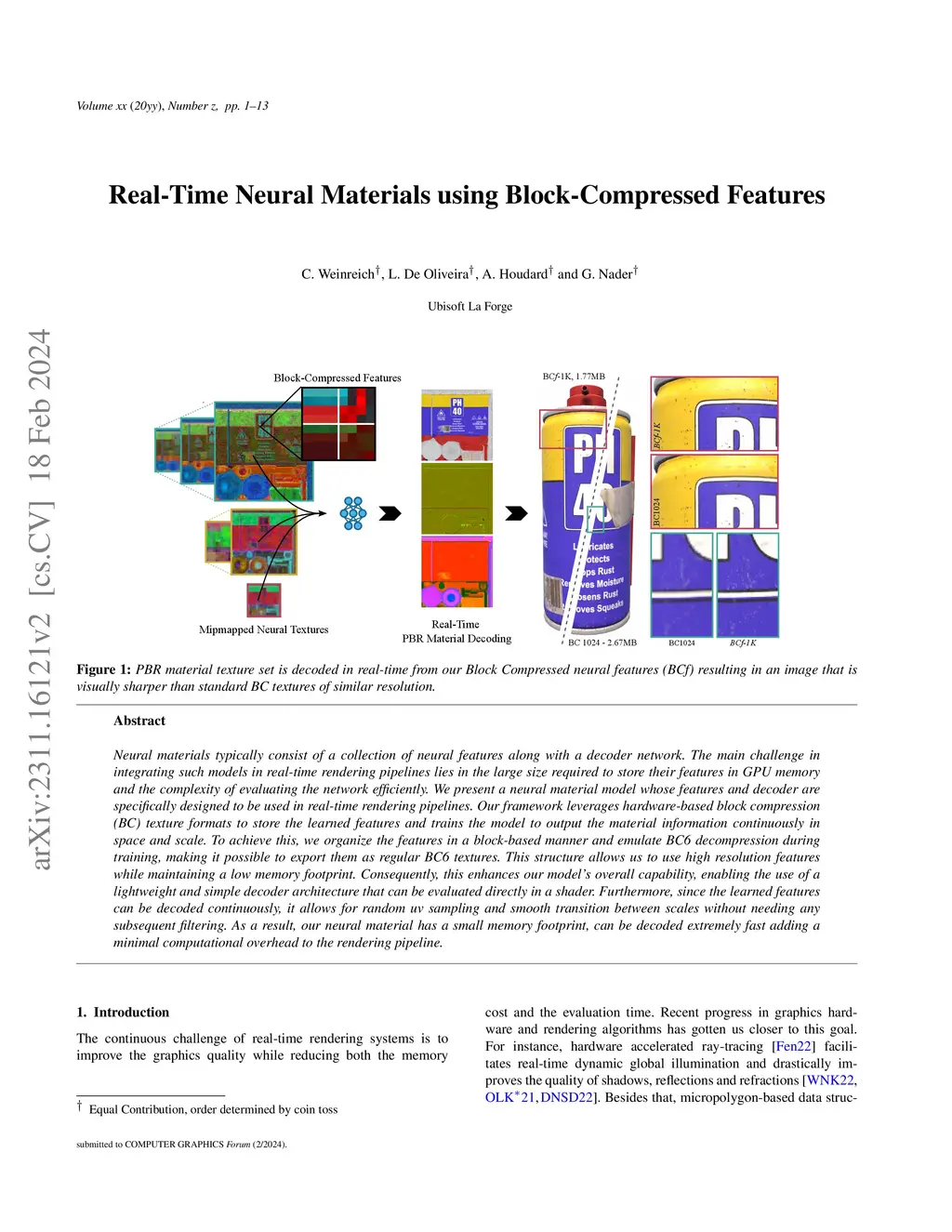 Neural materials typically consist of a collection of neural features along with a decoder network. The main challenge in integrating such models in real-time rendering pipelines lies in the large size required to store their features in GPU memory and the complexity of evaluating the network efficiently. We present a neural material model whose features and decoder are specifically designed to be used in real-time rendering pipelines. Our framework leverages hardware-based block compression (BC) texture formats to store the learned features and trains the model to output the material information continuously in space and scale. To achieve this, we organize the features in a block-based manner and emulate BC6 decompression during training, making it possible to export them as regular BC6 textures. This structure allows us to use high resolution features while maintaining a low memory footprint. Consequently, this enhances our model's overall capability, enabling the use of a lightweight and simple decoder architecture that can be evaluated directly in a shader. Furthermore, since the learned features can be decoded continuously, it allows for random uv sampling and smooth transition between scales without needing any subsequent filtering. As a result, our neural material has a small memory footprint, can be decoded extremely fast adding a minimal computational overhead to the rendering pipeline.
