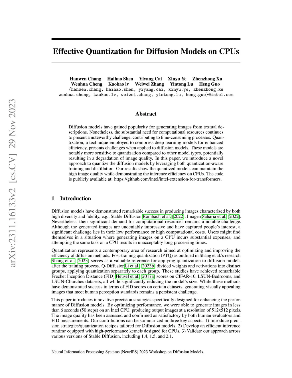 Diffusion models have gained popularity for generating images from textual descriptions. Nonetheless, the substantial need for computational resources continues to present a noteworthy challenge, contributing to time-consuming processes. Quantization, a technique employed to compress deep learning models for enhanced efficiency, presents challenges when applied to diffusion models. These models are notably more sensitive to quantization compared to other model types, potentially resulting in a degradation of image quality. In this paper, we introduce a novel approach to quantize the diffusion models by leveraging both quantization-aware training and distillation. Our results show the quantized models can maintain the high image quality while demonstrating the inference efficiency on CPUs. The code is publicly available at: https://github.com/intel/intel-extension-for-transformers.