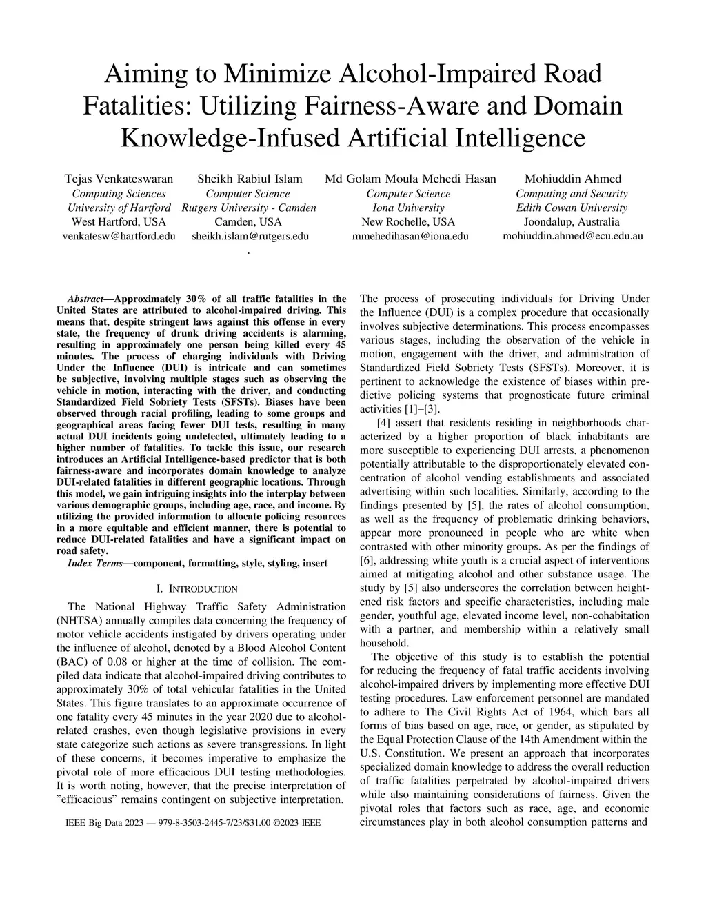 Approximately 30% of all traffic fatalities in the United States are attributed to alcohol-impaired driving. This means that, despite stringent laws against this offense in every state, the frequency of drunk driving accidents is alarming, resulting in approximately one person being killed every 45 minutes. The process of charging individuals with Driving Under the Influence (DUI) is intricate and can sometimes be subjective, involving multiple stages such as observing the vehicle in motion, interacting with the driver, and conducting Standardized Field Sobriety Tests (SFSTs). Biases have been observed through racial profiling, leading to some groups and geographical areas facing fewer DUI tests, resulting in many actual DUI incidents going undetected, ultimately leading to a higher number of fatalities. To tackle this issue, our research introduces an Artificial Intelligence-based predictor that is both fairness-aware and incorporates domain knowledge to analyze DUI-related fatalities in different geographic locations. Through this model, we gain intriguing insights into the interplay between various demographic groups, including age, race, and income. By utilizing the provided information to allocate policing resources in a more equitable and efficient manner, there is potential to reduce DUI-related fatalities and have a significant impact on road safety.