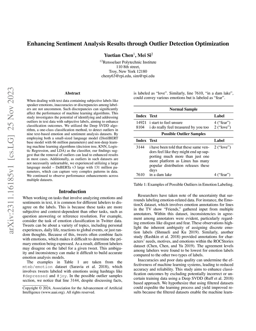 When dealing with text data containing subjective labels like speaker emotions, inaccuracies or discrepancies among labelers are not uncommon. Such discrepancies can significantly affect the performance of machine learning algorithms. This study investigates the potential of identifying and addressing outliers in text data with subjective labels, aiming to enhance classification outcomes. We utilized the Deep SVDD algorithm, a one-class classification method, to detect outliers in nine text-based emotion and sentiment analysis datasets. By employing both a small-sized language model (DistilBERT base model with 66 million parameters) and non-deep learning machine learning algorithms (decision tree, KNN, Logistic Regression, and LDA) as the classifier, our findings suggest that the removal of outliers can lead to enhanced results in most cases. Additionally, as outliers in such datasets are not necessarily unlearnable, we experienced utilizing a large language model -- DeBERTa v3 large with 131 million parameters, which can capture very complex patterns in data. We continued to observe performance enhancements across multiple datasets.