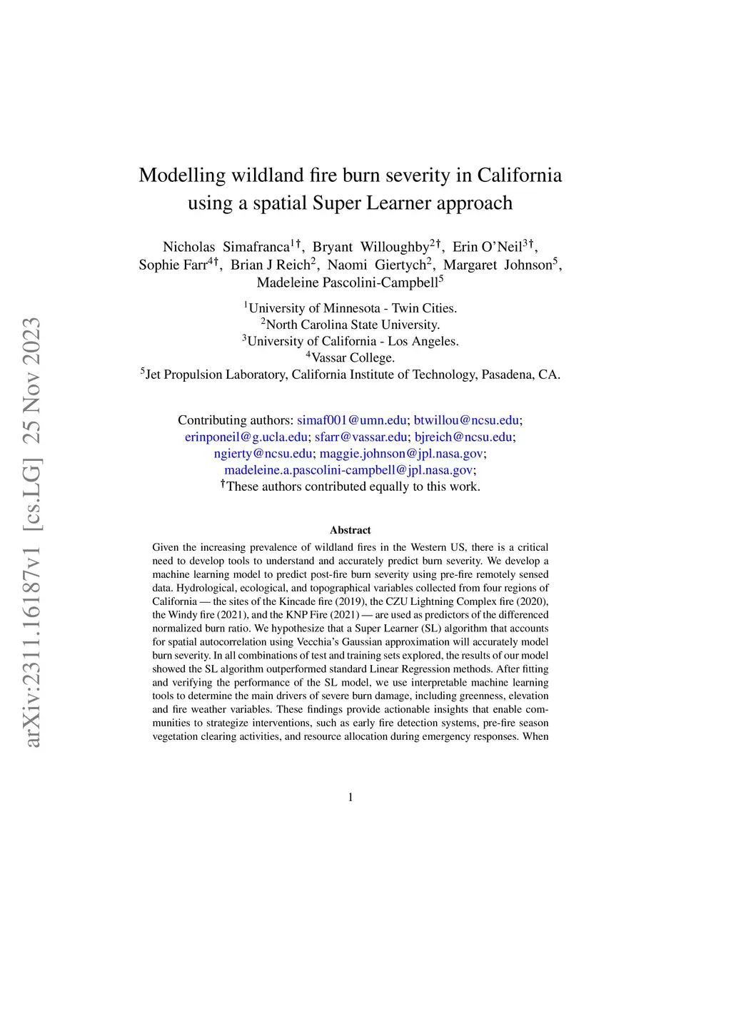 Given the increasing prevalence of wildland fires in the Western US, there is a critical need to develop tools to understand and accurately predict burn severity. We develop a machine learning model to predict post-fire burn severity using pre-fire remotely sensed data. Hydrological, ecological, and topographical variables collected from four regions of California - the sites of the Kincade fire (2019), the CZU Lightning Complex fire (2020), the Windy fire (2021), and the KNP Fire (2021) - are used as predictors of the difference normalized burn ratio. We hypothesize that a Super Learner (SL) algorithm that accounts for spatial autocorrelation using Vecchia's Gaussian approximation will accurately model burn severity. In all combinations of test and training sets explored, the results of our model showed the SL algorithm outperformed standard Linear Regression methods. After fitting and verifying the performance of the SL model, we use interpretable machine learning tools to determine the main drivers of severe burn damage, including greenness, elevation and fire weather variables. These findings provide actionable insights that enable communities to strategize interventions, such as early fire detection systems, pre-fire season vegetation clearing activities, and resource allocation during emergency responses. When implemented, this model has the potential to minimize the loss of human life, property, resources, and ecosystems in California.