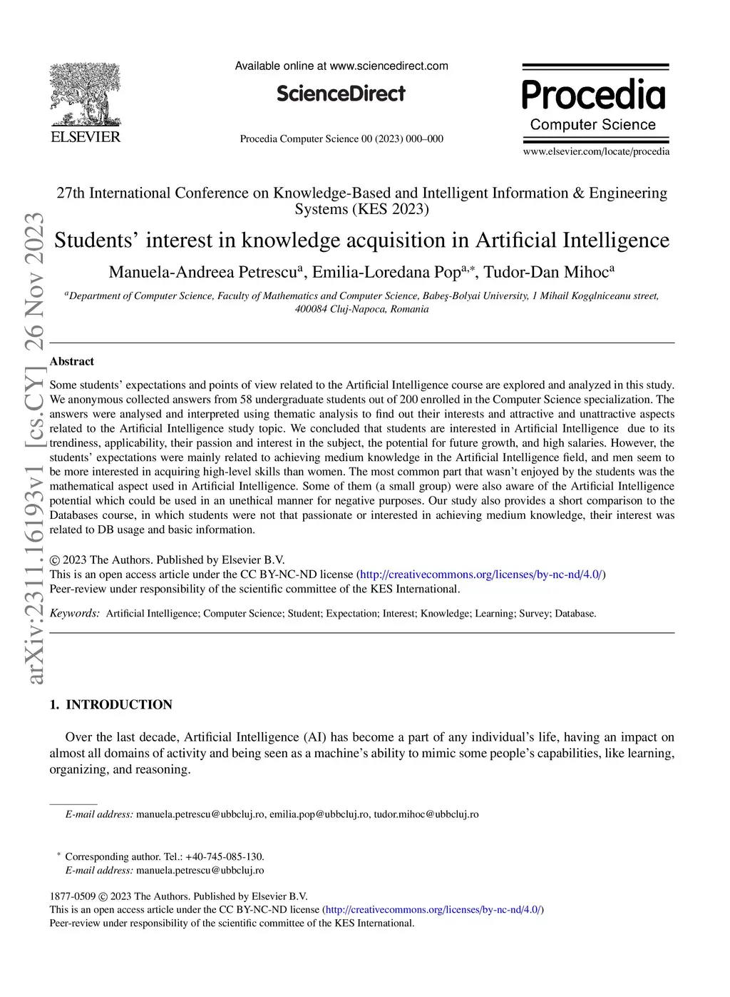 Students' interest in knowledge acquisition in Artificial Intelligence