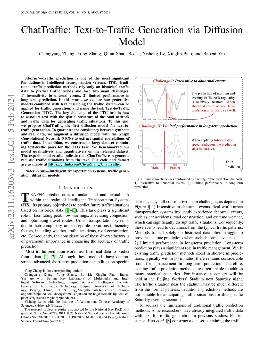 Traffic prediction is one of the most significant foundations in Intelligent Transportation Systems (ITS). Traditional traffic prediction methods rely only on historical traffic data to predict traffic trends and face two main challenges. 1) insensitivity to unusual events. 2) limited performance in long-term prediction. In this work, we explore how generative models combined with text describing the traffic system can be applied for traffic generation, and name the task Text-to-Traffic Generation (TTG). The key challenge of the TTG task is how to associate text with the spatial structure of the road network and traffic data for generating traffic situations. To this end, we propose ChatTraffic, the first diffusion model for text-to-traffic generation. To guarantee the consistency between synthetic and real data, we augment a diffusion model with the Graph Convolutional Network (GCN) to extract spatial correlations of traffic data. In addition, we construct a large dataset containing text-traffic pairs for the TTG task. We benchmarked our model qualitatively and quantitatively on the released dataset. The experimental results indicate that ChatTraffic can generate realistic traffic situations from the text. Our code and dataset are available at https://github.com/ChyaZhang/ChatTraffic.