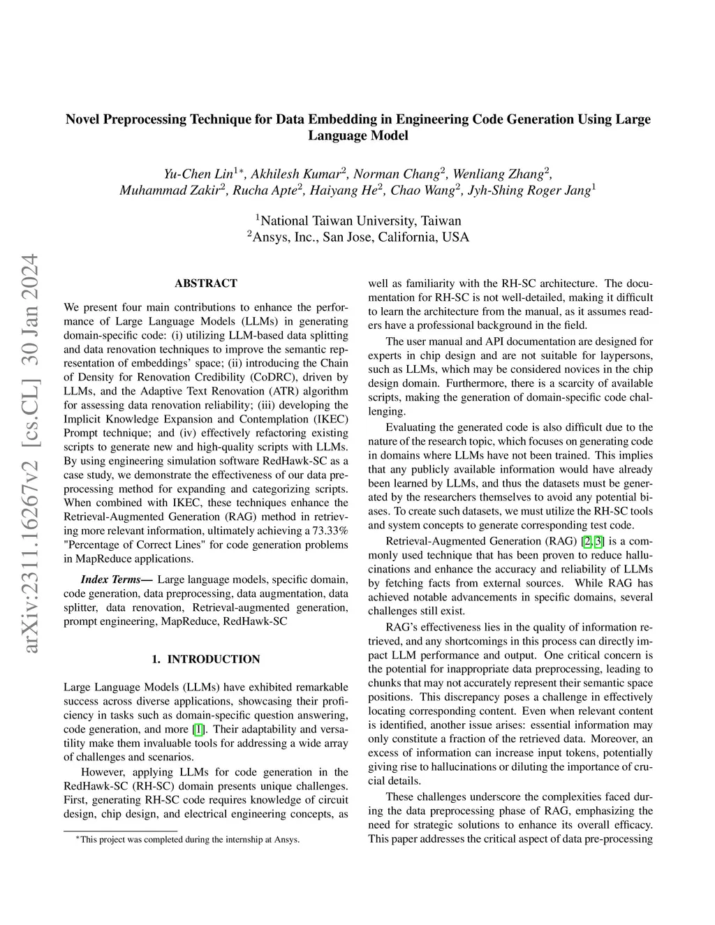 We present four main contributions to enhance the performance of Large Language Models (LLMs) in generating domain-specific code: (i) utilizing LLM-based data splitting and data renovation techniques to improve the semantic representation of embeddings' space; (ii) introducing the Chain of Density for Renovation Credibility (CoDRC), driven by LLMs, and the Adaptive Text Renovation (ATR) algorithm for assessing data renovation reliability; (iii) developing the Implicit Knowledge Expansion and Contemplation (IKEC) Prompt technique; and (iv) effectively refactoring existing scripts to generate new and high-quality scripts with LLMs. By using engineering simulation software RedHawk-SC as a case study, we demonstrate the effectiveness of our data pre-processing method for expanding and categorizing scripts. When combined with IKEC, these techniques enhance the Retrieval-Augmented Generation (RAG) method in retrieving more relevant information, ultimately achieving a 73.33% "Percentage of Correct Lines" for code generation problems in MapReduce applications.