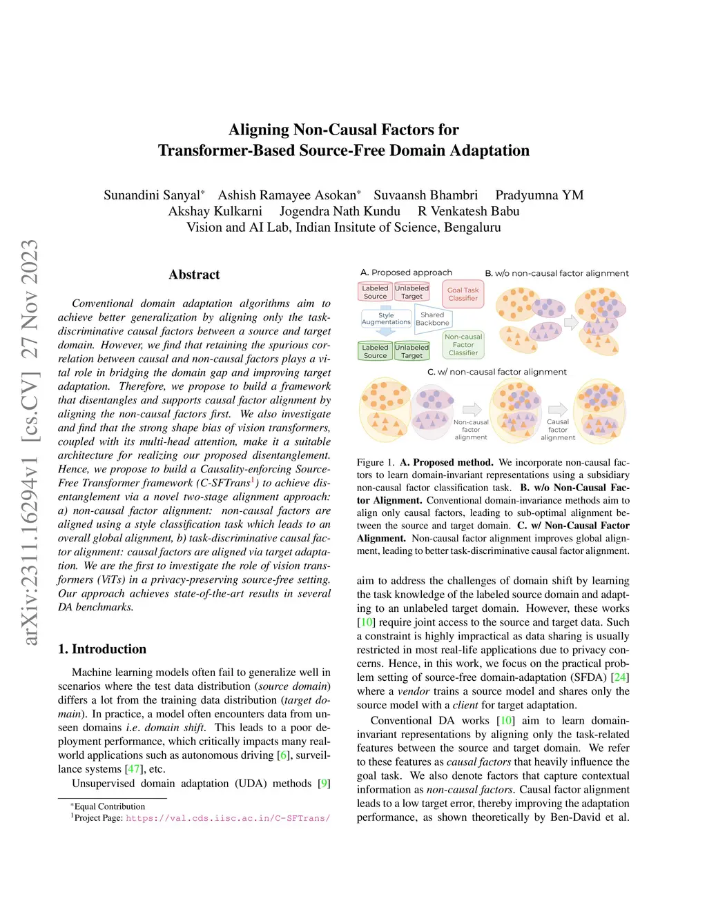 Conventional domain adaptation algorithms aim to achieve better generalization by aligning only the task-discriminative causal factors between a source and target domain. However, we find that retaining the spurious correlation between causal and non-causal factors plays a vital role in bridging the domain gap and improving target adaptation. Therefore, we propose to build a framework that disentangles and supports causal factor alignment by aligning the non-causal factors first. We also investigate and find that the strong shape bias of vision transformers, coupled with its multi-head attention, make it a suitable architecture for realizing our proposed disentanglement. Hence, we propose to build a Causality-enforcing Source-Free Transformer framework (C-SFTrans) to achieve disentanglement via a novel two-stage alignment approach: a) non-causal factor alignment: non-causal factors are aligned using a style classification task which leads to an overall global alignment, b) task-discriminative causal factor alignment: causal factors are aligned via target adaptation. We are the first to investigate the role of vision transformers (ViTs) in a privacy-preserving source-free setting. Our approach achieves state-of-the-art results in several DA benchmarks.