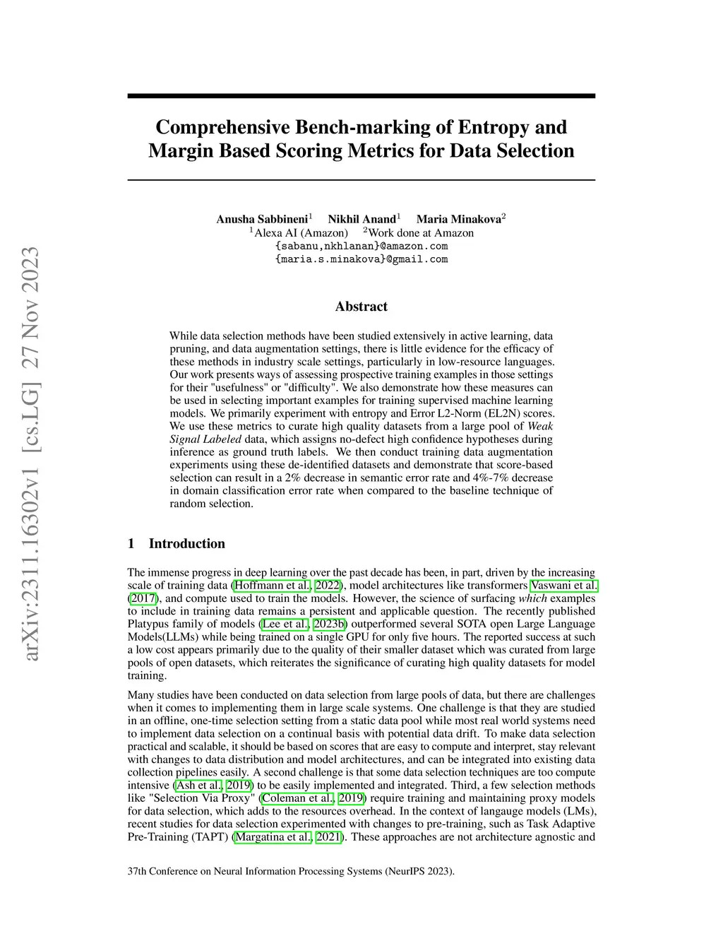While data selection methods have been studied extensively in active learning, data pruning, and data augmentation settings, there is little evidence for the efficacy of these methods in industry scale settings, particularly in low-resource languages. Our work presents ways of assessing prospective training examples in those settings for their "usefulness" or "difficulty". We also demonstrate how these measures can be used in selecting important examples for training supervised machine learning models. We primarily experiment with entropy and Error L2-Norm (EL2N) scores. We use these metrics to curate high quality datasets from a large pool of \textit{Weak Signal Labeled} data, which assigns no-defect high confidence hypotheses during inference as ground truth labels. We then conduct training data augmentation experiments using these de-identified datasets and demonstrate that score-based selection can result in a 2% decrease in semantic error rate and 4%-7% decrease in domain classification error rate when compared to the baseline technique of random selection.