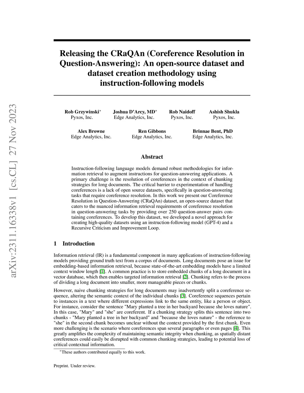 Instruction-following language models demand robust methodologies for information retrieval to augment instructions for question-answering applications. A primary challenge is the resolution of coreferences in the context of chunking strategies for long documents. The critical barrier to experimentation of handling coreferences is a lack of open source datasets, specifically in question-answering tasks that require coreference resolution. In this work we present our Coreference Resolution in Question-Answering (CRaQAn) dataset, an open-source dataset that caters to the nuanced information retrieval requirements of coreference resolution in question-answering tasks by providing over 250 question-answer pairs containing coreferences. To develop this dataset, we developed a novel approach for creating high-quality datasets using an instruction-following model (GPT-4) and a Recursive Criticism and Improvement Loop.