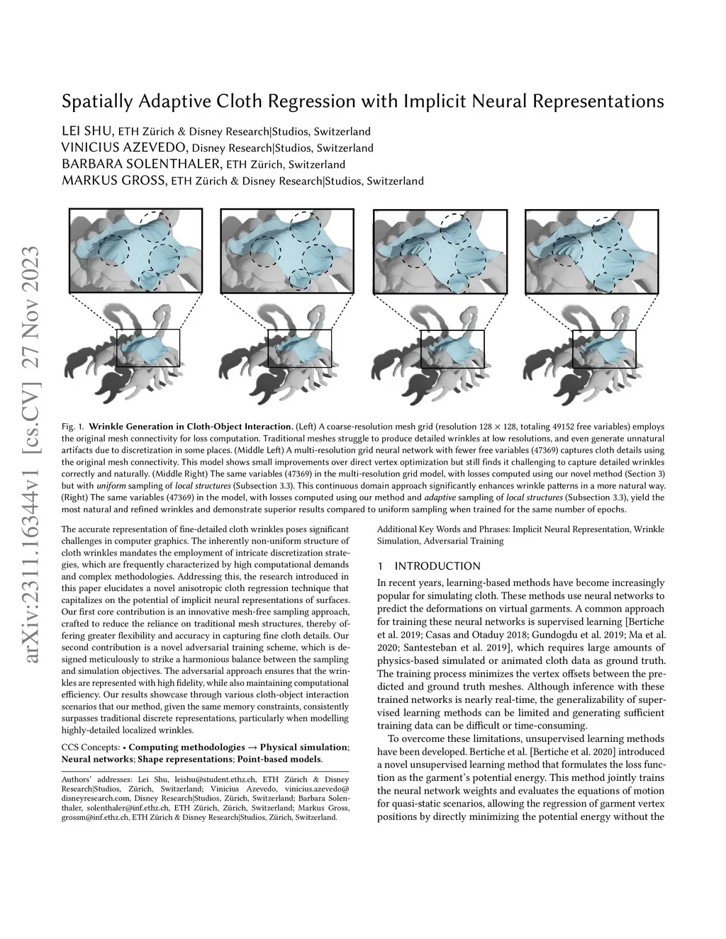 The accurate representation of fine-detailed cloth wrinkles poses significant challenges in computer graphics. The inherently non-uniform structure of cloth wrinkles mandates the employment of intricate discretization strategies, which are frequently characterized by high computational demands and complex methodologies. Addressing this, the research introduced in this paper elucidates a novel anisotropic cloth regression technique that capitalizes on the potential of implicit neural representations of surfaces. Our first core contribution is an innovative mesh-free sampling approach, crafted to reduce the reliance on traditional mesh structures, thereby offering greater flexibility and accuracy in capturing fine cloth details. Our second contribution is a novel adversarial training scheme, which is designed meticulously to strike a harmonious balance between the sampling and simulation objectives. The adversarial approach ensures that the wrinkles are represented with high fidelity, while also maintaining computational efficiency. Our results showcase through various cloth-object interaction scenarios that our method, given the same memory constraints, consistently surpasses traditional discrete representations, particularly when modelling highly-detailed localized wrinkles.