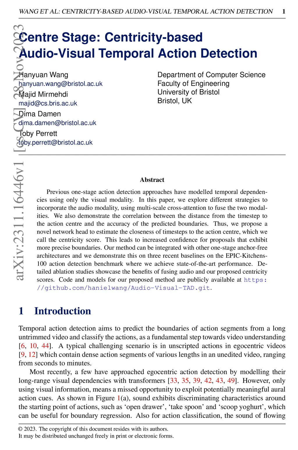 Previous one-stage action detection approaches have modelled temporal dependencies using only the visual modality. In this paper, we explore different strategies to incorporate the audio modality, using multi-scale cross-attention to fuse the two modalities. We also demonstrate the correlation between the distance from the timestep to the action centre and the accuracy of the predicted boundaries. Thus, we propose a novel network head to estimate the closeness of timesteps to the action centre, which we call the centricity score. This leads to increased confidence for proposals that exhibit more precise boundaries. Our method can be integrated with other one-stage anchor-free architectures and we demonstrate this on three recent baselines on the EPIC-Kitchens-100 action detection benchmark where we achieve state-of-the-art performance. Detailed ablation studies showcase the benefits of fusing audio and our proposed centricity scores. Code and models for our proposed method are publicly available at https://github.com/hanielwang/Audio-Visual-TAD.git