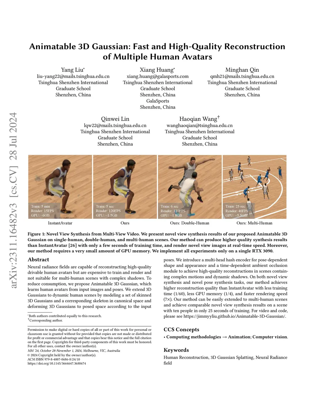 Animatable 3D Gaussian: Fast and High-Quality Reconstruction of Multiple