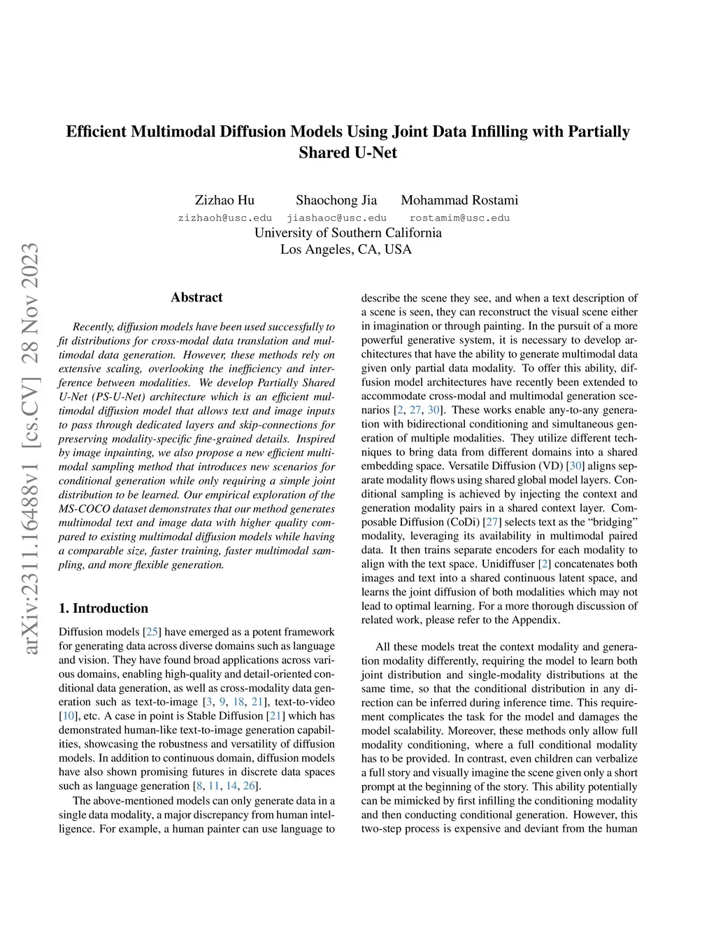 Recently, diffusion models have been used successfully to fit distributions for cross-modal data translation and multimodal data generation. However, these methods rely on extensive scaling, overlooking the inefficiency and interference between modalities. We develop Partially Shared U-Net (PS-U-Net) architecture which is an efficient multimodal diffusion model that allows text and image inputs to pass through dedicated layers and skip-connections for preserving modality-specific fine-grained details. Inspired by image inpainting, we also propose a new efficient multimodal sampling method that introduces new scenarios for conditional generation while only requiring a simple joint distribution to be learned. Our empirical exploration of the MS-COCO dataset demonstrates that our method generates multimodal text and image data with higher quality compared to existing multimodal diffusion models while having a comparable size, faster training, faster multimodal sampling, and more flexible generation.
