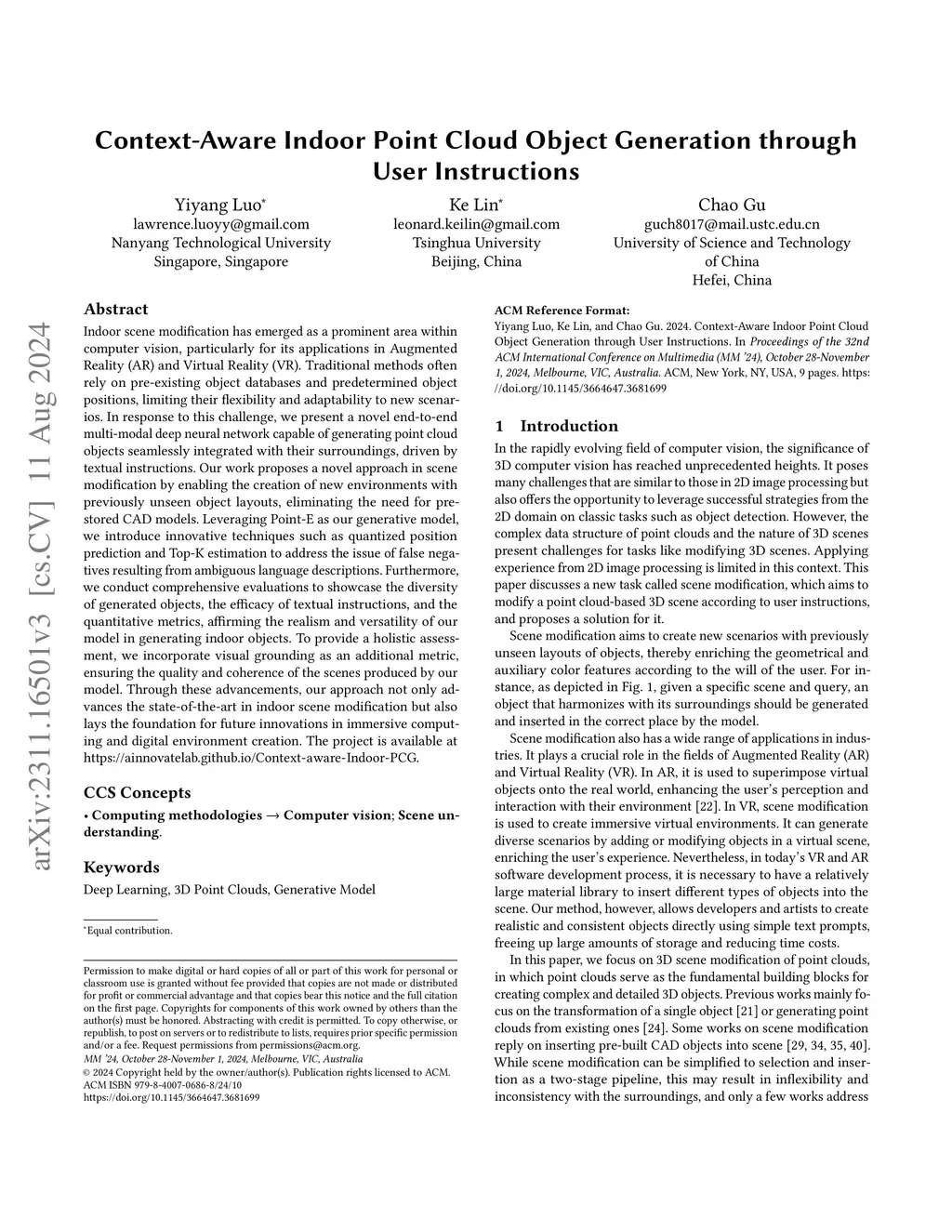 Indoor scene augmentation has become an emerging topic in the field of computer vision with applications in augmented and virtual reality. However, existing scene augmentation methods mostly require a pre-built object database with a given position as the desired location. In this paper, we propose the first end-to-end multi-modal deep neural network that can generate point cloud objects consistent with their surroundings, conditioned on text instructions. Our model generates a seemly object in the appropriate position based on the inputs of a query and point clouds, thereby enabling the creation of new scenarios involving previously unseen layouts of objects. Database of pre-stored CAD models is no longer needed. We use Point-E as our generative model and introduce methods including quantified position prediction and Top-K estimation to mitigate the false negative problems caused by ambiguous language description. Moreover, we evaluate the ability of our model by demonstrating the diversity of generated objects, the effectiveness of instruction, and quantitative metric results, which collectively indicate that our model is capable of generating realistic in-door objects. For a more thorough evaluation, we also incorporate visual grounding as a metric to assess the quality of the scenes generated by our model.