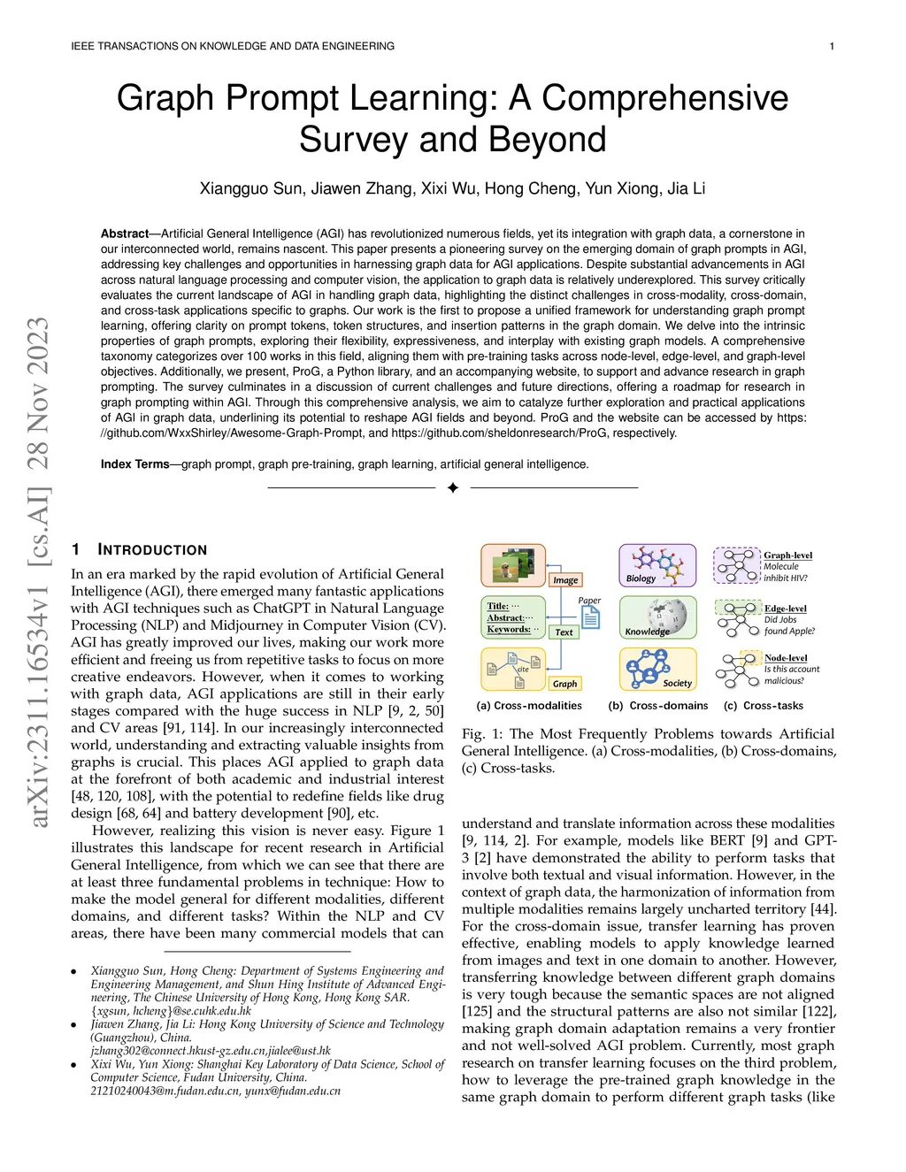 Artificial General Intelligence (AGI) has revolutionized numerous fields, yet its integration with graph data, a cornerstone in our interconnected world, remains nascent. This paper presents a pioneering survey on the emerging domain of graph prompts in AGI, addressing key challenges and opportunities in harnessing graph data for AGI applications. Despite substantial advancements in AGI across natural language processing and computer vision, the application to graph data is relatively underexplored. This survey critically evaluates the current landscape of AGI in handling graph data, highlighting the distinct challenges in cross-modality, cross-domain, and cross-task applications specific to graphs. Our work is the first to propose a unified framework for understanding graph prompt learning, offering clarity on prompt tokens, token structures, and insertion patterns in the graph domain. We delve into the intrinsic properties of graph prompts, exploring their flexibility, expressiveness, and interplay with existing graph models. A comprehensive taxonomy categorizes over 100 works in this field, aligning them with pre-training tasks across node-level, edge-level, and graph-level objectives. Additionally, we present, ProG, a Python library, and an accompanying website, to support and advance research in graph prompting. The survey culminates in a discussion of current challenges and future directions, offering a roadmap for research in graph prompting within AGI. Through this comprehensive analysis, we aim to catalyze further exploration and practical applications of AGI in graph data, underlining its potential to reshape AGI fields and beyond. ProG and the website can be accessed by \url{https://github.com/WxxShirley/Awesome-Graph-Prompt}, and \url{https://github.com/sheldonresearch/ProG}, respectively.