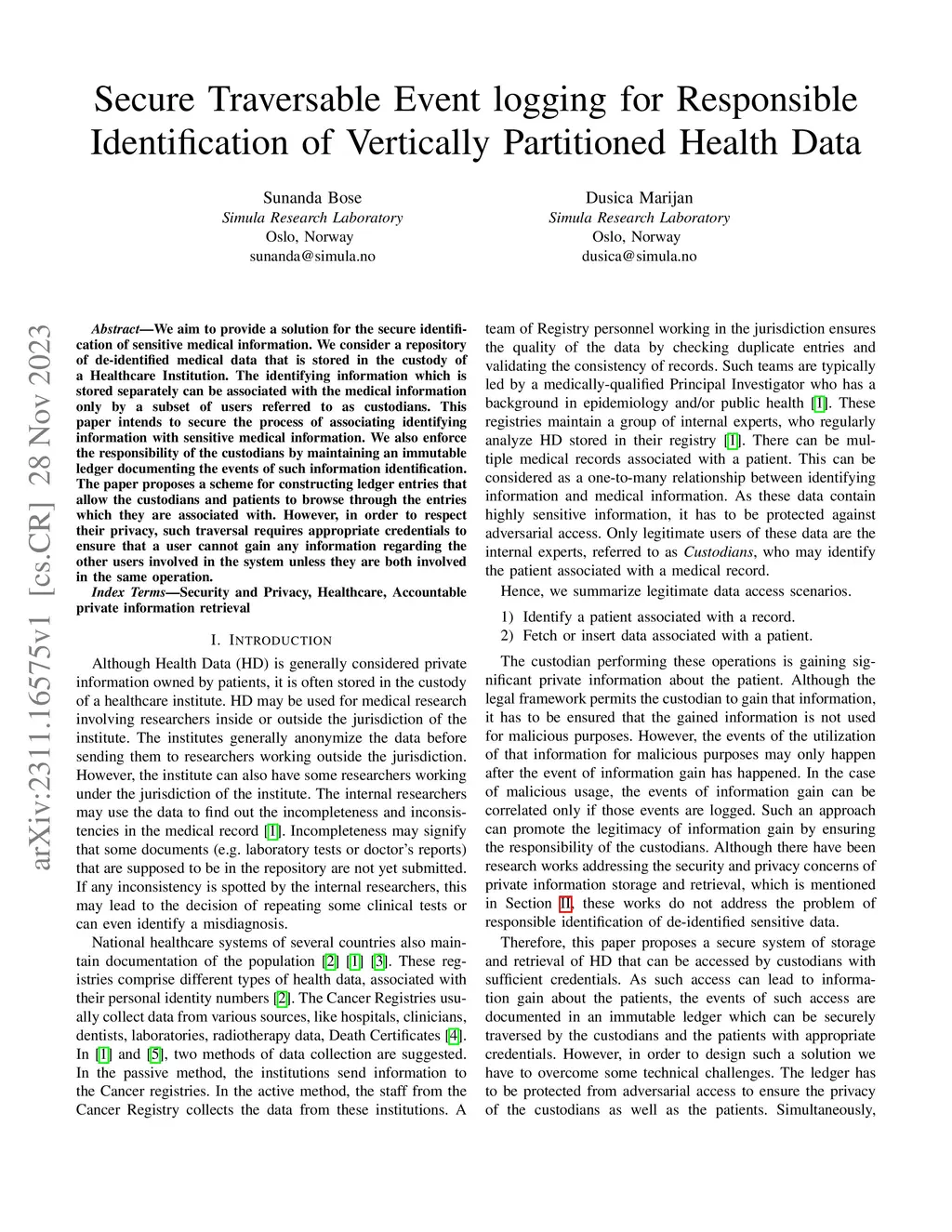 We aim to provide a solution for the secure identification of sensitive medical information. We consider a repository of de-identified medical data that is stored in the custody of a Healthcare Institution. The identifying information that is stored separately can be associated with the medical information only by a subset of users referred to as custodians. This paper intends to secure the process of associating identifying information with sensitive medical information. We also enforce the responsibility of the custodians by maintaining an immutable ledger documenting the events of such information identification. The paper proposes a scheme for constructing ledger entries that allow the custodians and patients to browse through the entries which they are associated with. However, in order to respect their privacy, such traversal requires appropriate credentials to ensure that a user cannot gain any information regarding the other users involved in the system unless they are both involved in the same operation.