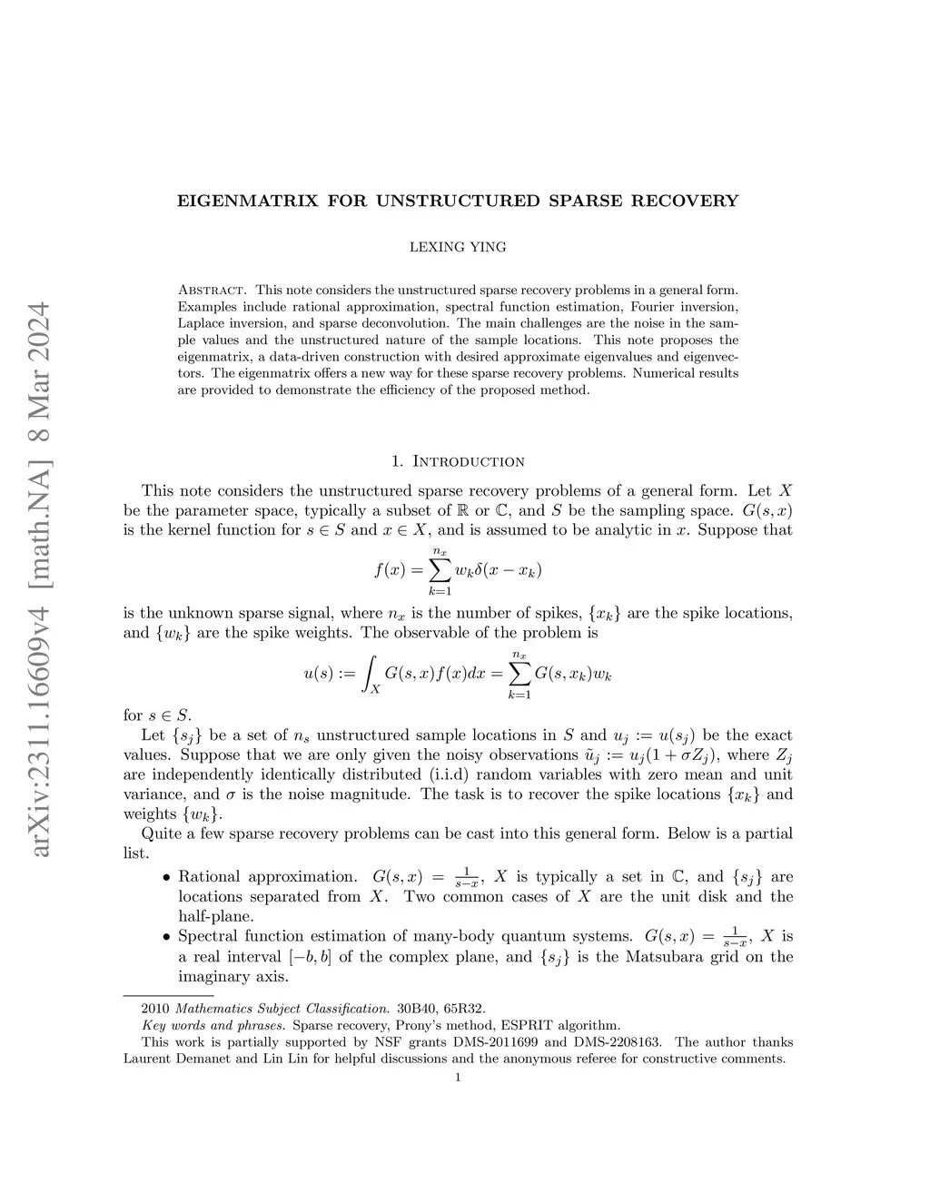 This note considers the unstructured sparse recovery problems in a general form. Examples include rational approximation, spectral function estimation, Fourier inversion, Laplace inversion, and sparse deconvolution. The main challenges are the noise in the sample values and the unstructured nature of the sample locations. This note proposes the eigenmatrix, a data-driven construction with desired approximate eigenvalues and eigenvectors. The eigenmatrix offers a new way for these sparse recovery problems. Numerical results are provided to demonstrate the efficiency of the proposed method.