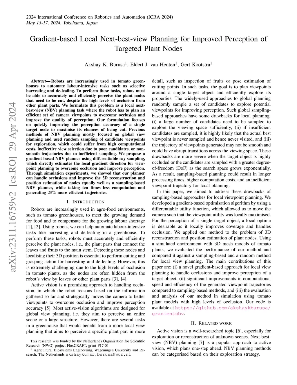 Robots are increasingly used in tomato greenhouses to automate labour-intensive tasks such as selective harvesting and de-leafing. To perform these tasks, robots must be able to accurately and efficiently perceive the plant nodes that need to be cut, despite the high levels of occlusion from other plant parts. We formulate this problem as a local next-best-view (NBV) planning task where the robot has to plan an efficient set of camera viewpoints to overcome occlusion and improve the quality of perception. Our formulation focuses on quickly improving the perception accuracy of a single target node to maximise its chances of being cut. Previous methods of NBV planning mostly focused on global view planning and used random sampling of candidate viewpoints for exploration, which could suffer from high computational costs, ineffective view selection due to poor candidates, or non-smooth trajectories due to inefficient sampling. We propose a gradient-based NBV planner using differential ray sampling, which directly estimates the local gradient direction for viewpoint planning to overcome occlusion and improve perception. Through simulation experiments, we showed that our planner can handle occlusions and improve the 3D reconstruction and position estimation of nodes equally well as a sampling-based NBV planner, while taking ten times less computation and generating 28% more efficient trajectories.