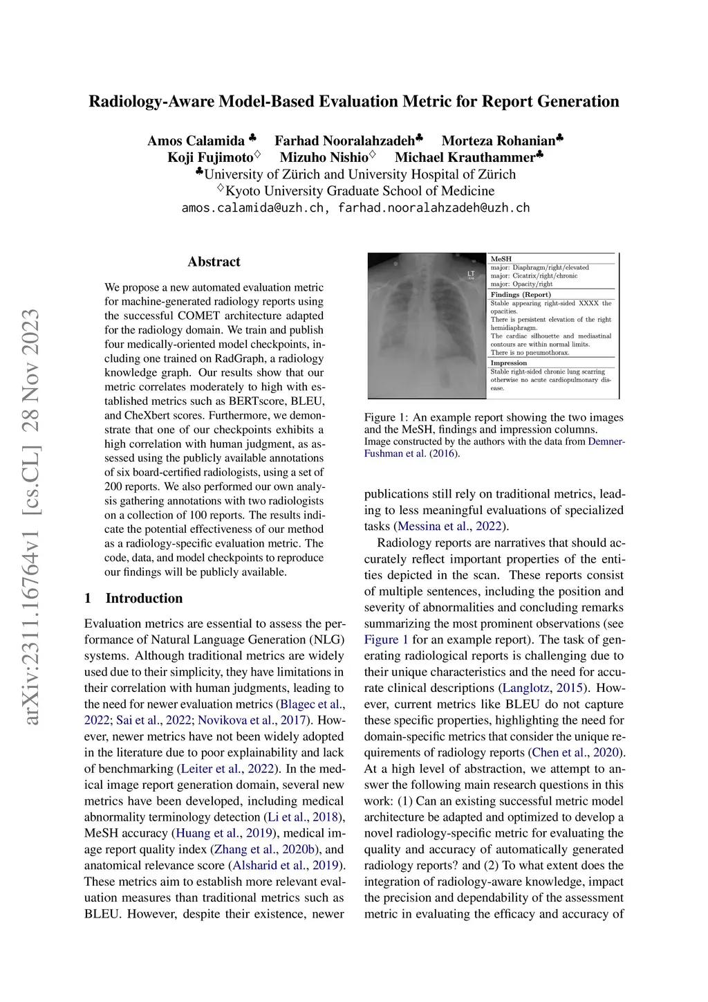 We propose a new automated evaluation metric for machine-generated radiology reports using the successful COMET architecture adapted for the radiology domain. We train and publish four medically-oriented model checkpoints, including one trained on RadGraph, a radiology knowledge graph. Our results show that our metric correlates moderately to high with established metrics such as BERTscore, BLEU, and CheXbert scores. Furthermore, we demonstrate that one of our checkpoints exhibits a high correlation with human judgment, as assessed using the publicly available annotations of six board-certified radiologists, using a set of 200 reports. We also performed our own analysis gathering annotations with two radiologists on a collection of 100 reports. The results indicate the potential effectiveness of our method as a radiology-specific evaluation metric. The code, data, and model checkpoints to reproduce our findings will be publicly available.