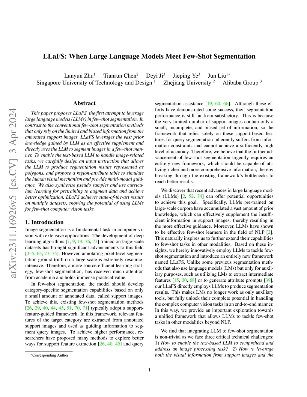 This paper proposes LLaFS, the first attempt to leverage large language models (LLMs) in few-shot segmentation. In contrast to the conventional few-shot segmentation methods that only rely on the limited and biased information from the annotated support images, LLaFS leverages the vast prior knowledge gained by LLM as an effective supplement and directly uses the LLM to segment images in a few-shot manner. To enable the text-based LLM to handle image-related tasks, we carefully design an input instruction that allows the LLM to produce segmentation results represented as polygons, and propose a region-attribute table to simulate the human visual mechanism and provide multi-modal guidance. We also synthesize pseudo samples and use curriculum learning for pretraining to augment data and achieve better optimization. LLaFS achieves state-of-the-art results on multiple datasets, showing the potential of using LLMs for few-shot computer vision tasks.
