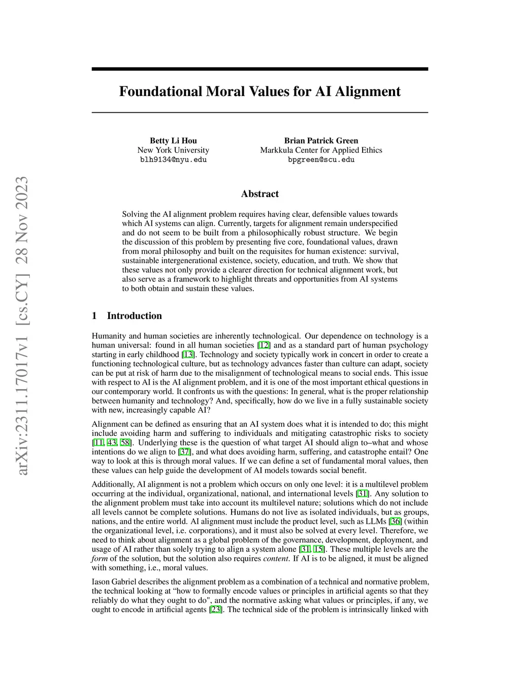 Solving the AI alignment problem requires having clear, defensible values towards which AI systems can align. Currently, targets for alignment remain underspecified and do not seem to be built from a philosophically robust structure. We begin the discussion of this problem by presenting five core, foundational values, drawn from moral philosophy and built on the requisites for human existence: survival, sustainable intergenerational existence, society, education, and truth. We show that these values not only provide a clearer direction for technical alignment work, but also serve as a framework to highlight threats and opportunities from AI systems to both obtain and sustain these values.