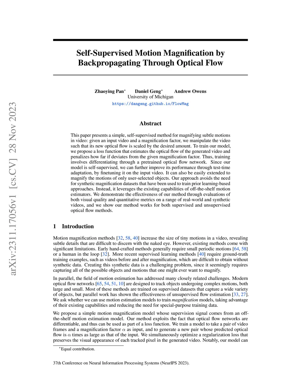 This paper presents a simple, self-supervised method for magnifying subtle motions in video: given an input video and a magnification factor, we manipulate the video such that its new optical flow is scaled by the desired amount. To train our model, we propose a loss function that estimates the optical flow of the generated video and penalizes how far if deviates from the given magnification factor. Thus, training involves differentiating through a pretrained optical flow network. Since our model is self-supervised, we can further improve its performance through test-time adaptation, by finetuning it on the input video. It can also be easily extended to magnify the motions of only user-selected objects. Our approach avoids the need for synthetic magnification datasets that have been used to train prior learning-based approaches. Instead, it leverages the existing capabilities of off-the-shelf motion estimators. We demonstrate the effectiveness of our method through evaluations of both visual quality and quantitative metrics on a range of real-world and synthetic videos, and we show our method works for both supervised and unsupervised optical flow methods.