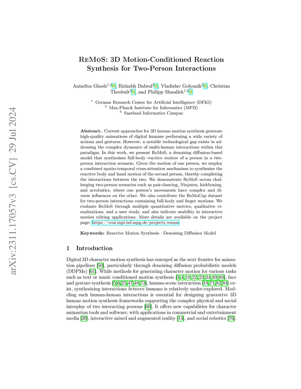 Current approaches for 3D human motion synthesis generate high-quality animations of digital humans performing a wide variety of actions and gestures. However, a notable technological gap exists in addressing the complex dynamics of multi-human interactions within this paradigm. In this work, we present ReMoS, a denoising diffusion-based model that synthesizes full-body reactive motion of a person in a two-person interaction scenario. Assuming the motion of one person is given, we employ a combined spatio-temporal cross-attention mechanism to synthesize the reactive body and hand motion of the second person, thereby completing the interactions between the two. We demonstrate ReMoS across challenging two-person scenarios such as pair-dancing, Ninjutsu, kickboxing, and acrobatics, where one person's movements have complex and diverse influences on the other. We also contribute the ReMoCap dataset for two-person interactions containing full-body and finger motions. We evaluate ReMoS through multiple quantitative metrics, qualitative visualizations, and a user study, and also indicate usability in interactive motion editing applications.
