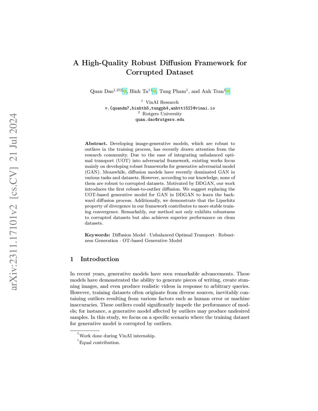 Diffusion models, a type of generative model, have demonstrated great potential for synthesizing highly detailed images. By integrating with GAN, advanced diffusion models like DDGAN \citep{xiao2022DDGAN} could approach real-time performance for expansive practical applications. While DDGAN has effectively addressed the challenges of generative modeling, namely producing high-quality samples, covering different data modes, and achieving faster sampling, it remains susceptible to performance drops caused by datasets that are corrupted with outlier samples. This work introduces a robust training technique based on semi-unbalanced optimal transport to mitigate the impact of outliers effectively. Through comprehensive evaluations, we demonstrate that our robust diffusion GAN (RDGAN) outperforms vanilla DDGAN in terms of the aforementioned generative modeling criteria, i.e., image quality, mode coverage of distribution, and inference speed, and exhibits improved robustness when dealing with both clean and corrupted datasets.