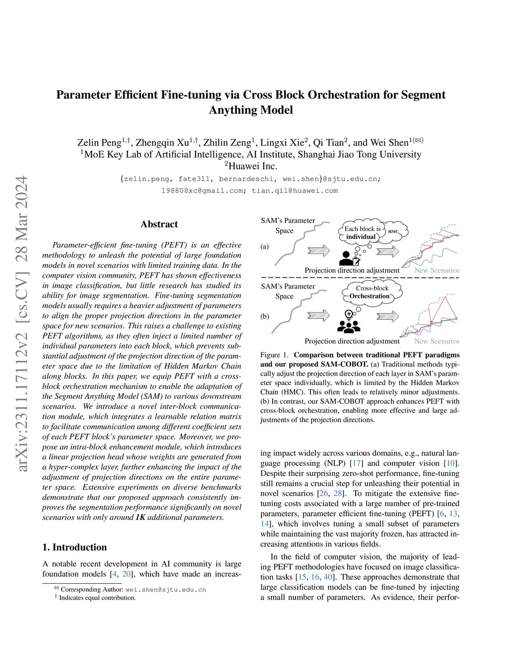 Parameter-efficient fine-tuning (PEFT) is an effective methodology to unleash the potential of large foundation models in novel scenarios with limited training data. In the computer vision community, PEFT has shown effectiveness in image classification, but little research has studied its ability for image segmentation. Fine-tuning segmentation models usually require a heavier adjustment of parameters to align the proper projection directions in the parameter space for new scenarios. This raises a challenge to existing PEFT algorithms, as they often inject a limited number of individual parameters into each block, which prevents substantial adjustment of the projection direction of the parameter space due to the limitation of Hidden Markov Chain along blocks. In this paper, we equip PEFT with a cross-block orchestration mechanism to enable the adaptation of the Segment Anything Model (SAM) to various downstream scenarios. We introduce a novel inter-block communication module, which integrates a learnable relation matrix to facilitate communication among different coefficient sets of each PEFT block's parameter space. Moreover, we propose an intra-block enhancement module, which introduces a linear projection head whose weights are generated from a hyper-complex layer, further enhancing the impact of the adjustment of projection directions on the entire parameter space. Extensive experiments on diverse benchmarks demonstrate that our proposed approach consistently improves the segmentation performance significantly on novel scenarios with only around 1K additional parameters.