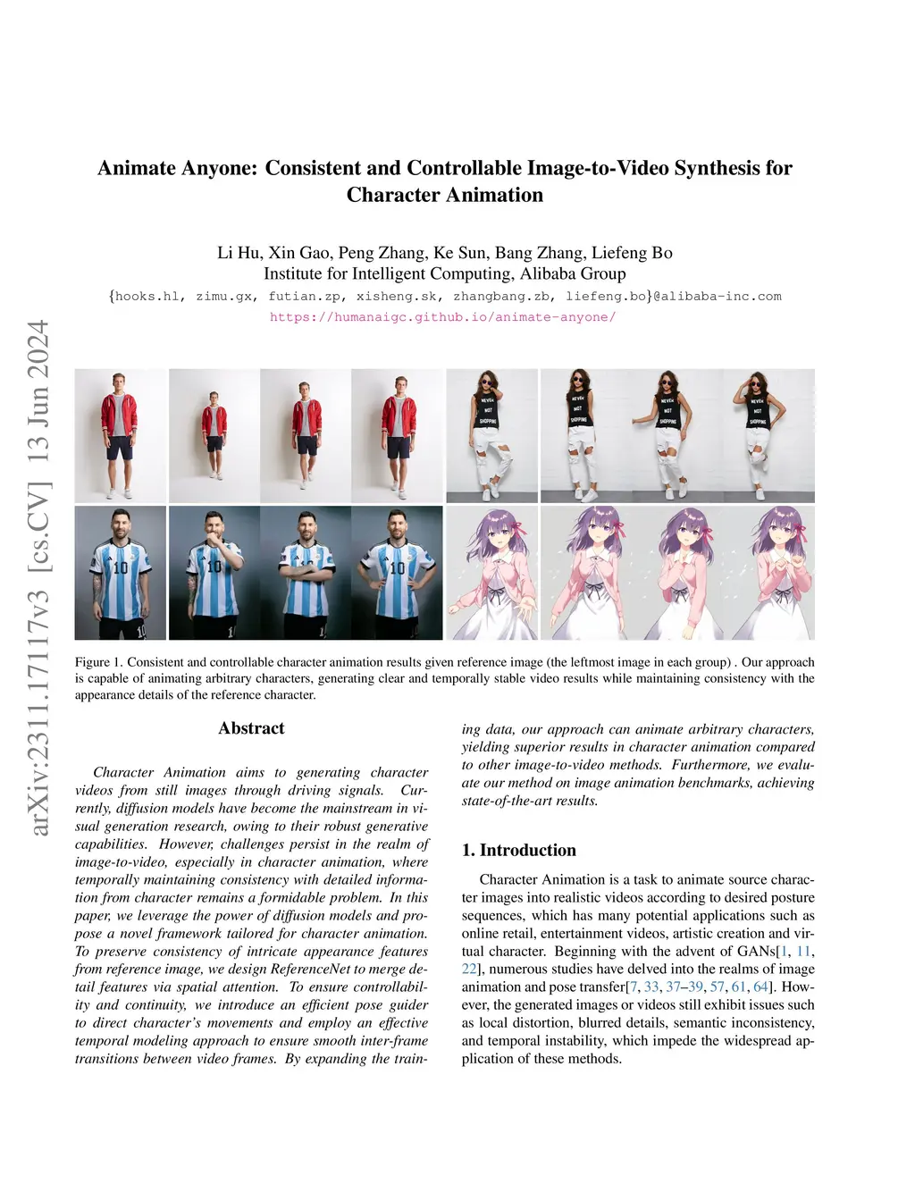 Character Animation aims to generating character videos from still images through driving signals. Currently, diffusion models have become the mainstream in visual generation research, owing to their robust generative capabilities. However, challenges persist in the realm of image-to-video, especially in character animation, where temporally maintaining consistency with detailed information from character remains a formidable problem. In this paper, we leverage the power of diffusion models and propose a novel framework tailored for character animation. To preserve consistency of intricate appearance features from reference image, we design ReferenceNet to merge detail features via spatial attention. To ensure controllability and continuity, we introduce an efficient pose guider to direct character's movements and employ an effective temporal modeling approach to ensure smooth inter-frame transitions between video frames. By expanding the training data, our approach can animate arbitrary characters, yielding superior results in character animation compared to other image-to-video methods. Furthermore, we evaluate our method on benchmarks for fashion video and human dance synthesis, achieving state-of-the-art results.