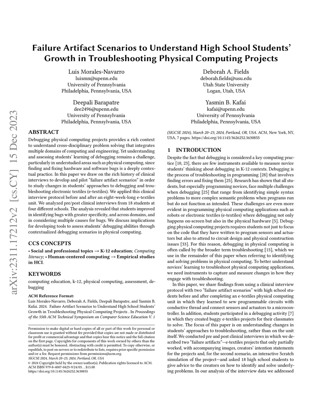 Debugging physical computing projects provides a rich context to understand cross-disciplinary problem solving that integrates multiple domains of computing and engineering. Yet understanding and assessing students' learning of debugging remains a challenge, particularly in understudied areas such as physical computing, since finding and fixing hardware and software bugs is a deeply contextual practice. In this paper we draw on the rich history of clinical interviews to develop and pilot "failure artifact scenarios" in order to study changes in students' approaches to debugging and troubleshooting electronic textiles (e-textiles). We applied this clinical interview protocol before and after an eight-week-long e-textiles unit. We analyzed pre/post clinical interviews from 18 students at four different schools. The analysis revealed that students improved in identifying bugs with greater specificity, and across domains, and in considering multiple causes for bugs. We discuss implications for developing tools to assess students' debugging abilities through contextualized debugging scenarios in physical computing.