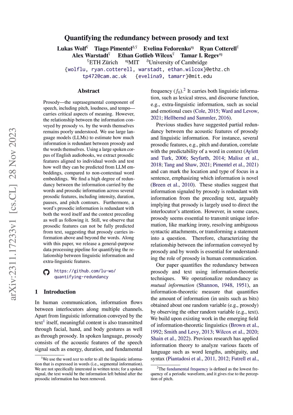 Prosody -- the suprasegmental component of speech, including pitch, loudness, and tempo -- carries critical aspects of meaning. However, the relationship between the information conveyed by prosody vs. by the words themselves remains poorly understood. We use large language models (LLMs) to estimate how much information is redundant between prosody and the words themselves. Using a large spoken corpus of English audiobooks, we extract prosodic features aligned to individual words and test how well they can be predicted from LLM embeddings, compared to non-contextual word embeddings. We find a high degree of redundancy between the information carried by the words and prosodic information across several prosodic features, including intensity, duration, pauses, and pitch contours. Furthermore, a word's prosodic information is redundant with both the word itself and the context preceding as well as following it. Still, we observe that prosodic features can not be fully predicted from text, suggesting that prosody carries information above and beyond the words. Along with this paper, we release a general-purpose data processing pipeline for quantifying the relationship between linguistic information and extra-linguistic features.