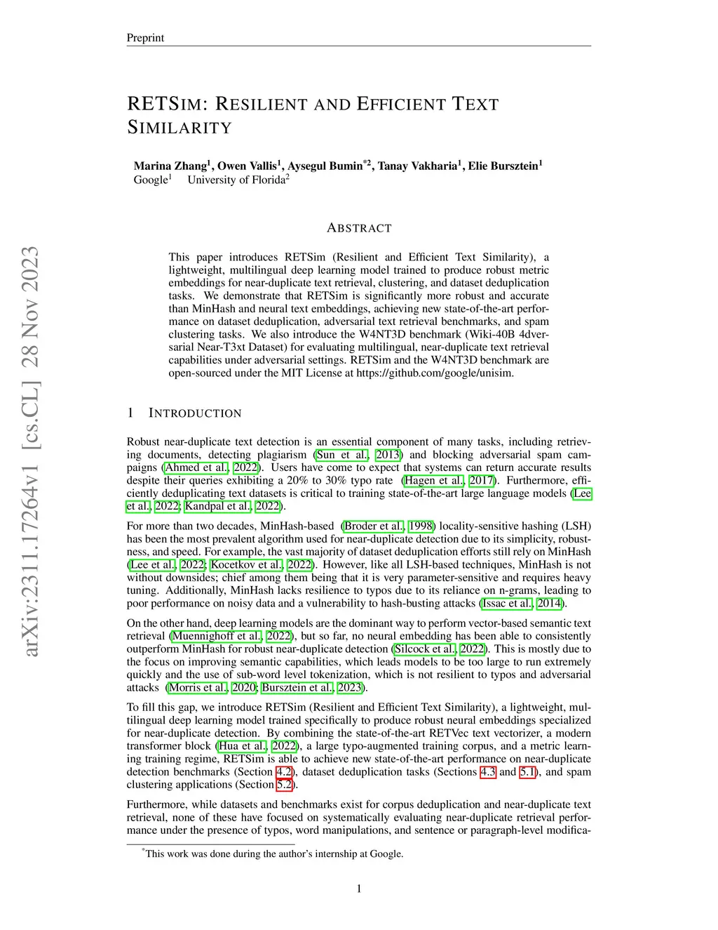This paper introduces RETSim (Resilient and Efficient Text Similarity), a lightweight, multilingual deep learning model trained to produce robust metric embeddings for near-duplicate text retrieval, clustering, and dataset deduplication tasks. We demonstrate that RETSim is significantly more robust and accurate than MinHash and neural text embeddings, achieving new state-of-the-art performance on dataset deduplication, adversarial text retrieval benchmarks, and spam clustering tasks. We also introduce the W4NT3D benchmark (Wiki-40B 4dversarial Near-T3xt Dataset) for evaluating multilingual, near-duplicate text retrieval capabilities under adversarial settings. RETSim and the W4NT3D benchmark are open-sourced under the MIT License at https://github.com/google/unisim.