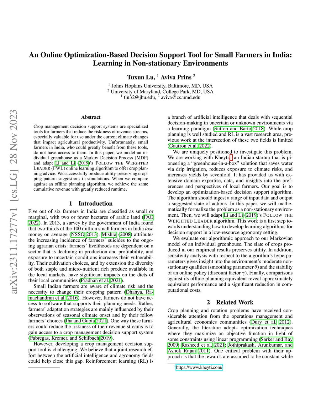 An Online Optimization-Based Decision Support Tool for Small Farmers in