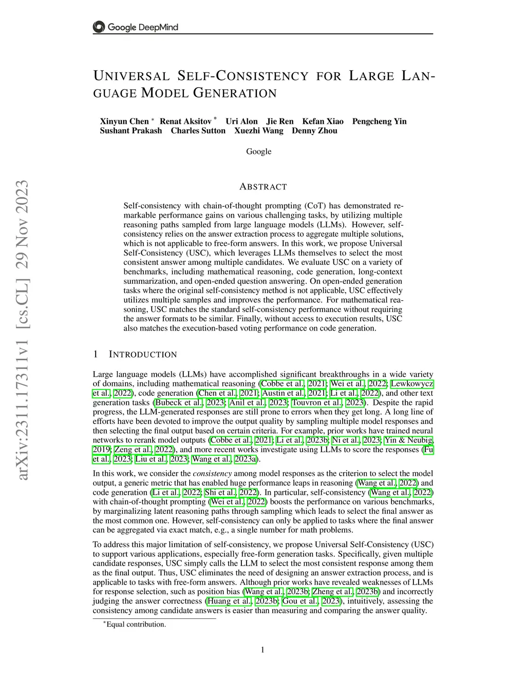 Self-consistency with chain-of-thought prompting (CoT) has demonstrated remarkable performance gains on various challenging tasks, by utilizing multiple reasoning paths sampled from large language models (LLMs). However, self-consistency relies on the answer extraction process to aggregate multiple solutions, which is not applicable to free-form answers. In this work, we propose Universal Self-Consistency (USC), which leverages LLMs themselves to select the most consistent answer among multiple candidates. We evaluate USC on a variety of benchmarks, including mathematical reasoning, code generation, long-context summarization, and open-ended question answering. On open-ended generation tasks where the original self-consistency method is not applicable, USC effectively utilizes multiple samples and improves the performance. For mathematical reasoning, USC matches the standard self-consistency performance without requiring the answer formats to be similar. Finally, without access to execution results, USC also matches the execution-based voting performance on code generation.