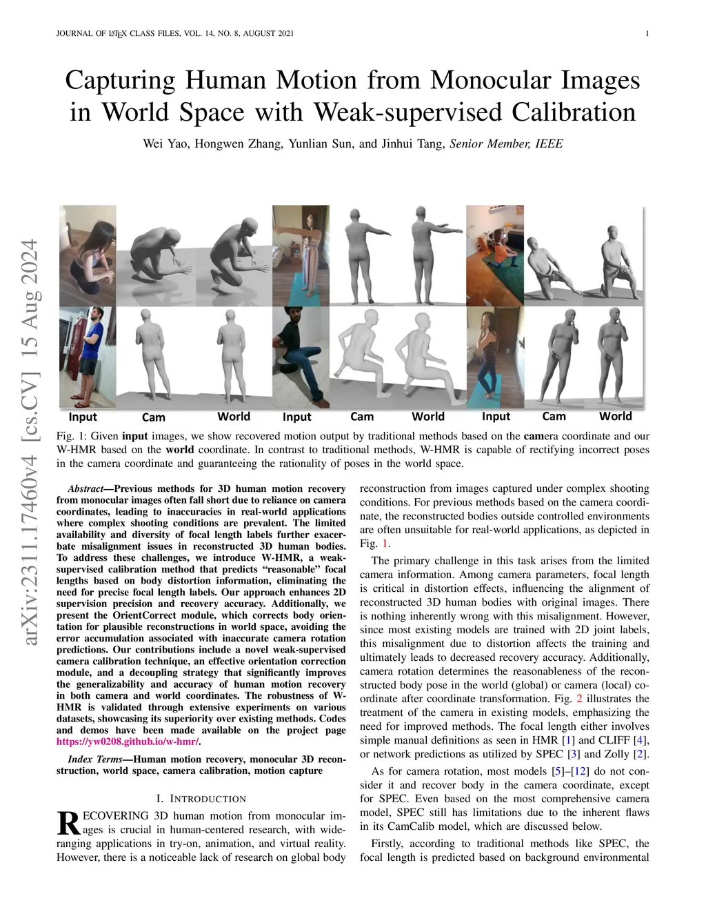 For a long time, in reconstructing 3D human bodies from monocular images, most methods opted to simplify the task by minimizing the influence of the camera. Using a coarse focal length setting results in the reconstructed bodies not aligning well with distorted images. Ignoring camera rotation leads to an unrealistic reconstructed body pose in world space. Consequently, the application scenarios of existing methods are confined to controlled environments. When confronted with complex and diverse in-the-wild images, they struggle to achieve accurate and reasonable reconstruction in world space. To address the above issues, we propose W-HMR, which decouples global body recovery into camera calibration, local body recovery, and global body orientation correction. We design the first weak-supervised camera calibration method for body distortion, eliminating dependence on focal length labels and achieving finer mesh-image alignment. We propose a novel orientation correction module to allow the reconstructed human body to remain normal in world space. Decoupling body orientation and body pose enables our model to consider the accuracy in camera coordinate and the reasonableness in world coordinate simultaneously, expanding the range of applications. As a result, W-HMR achieves high-quality reconstruction in dual coordinate systems, particularly in challenging scenes. Codes and demos have been released on the project page https://yw0208.github.io/w-hmr/.