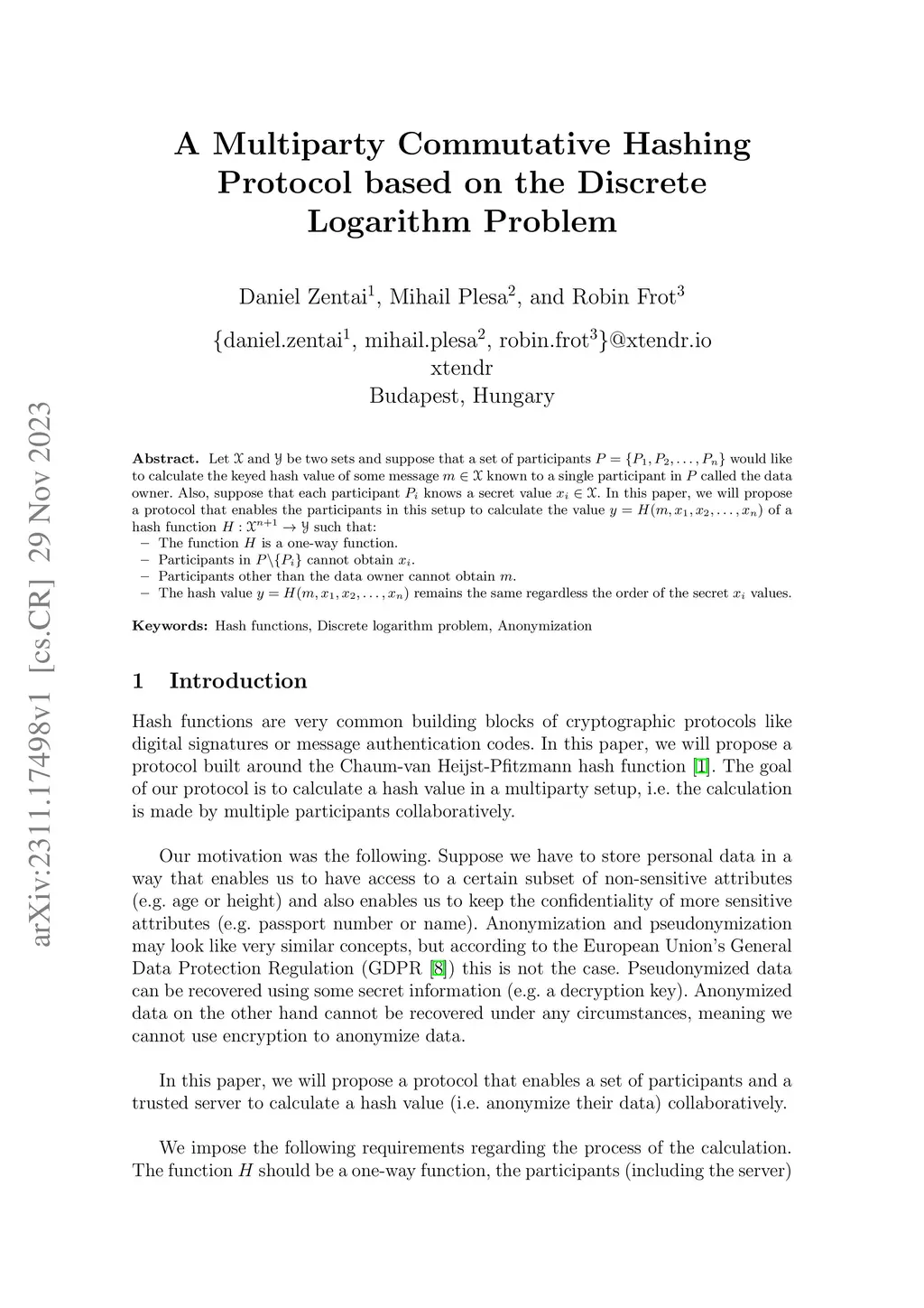 A Multiparty Commutative Hashing Protocol based on the Discrete
