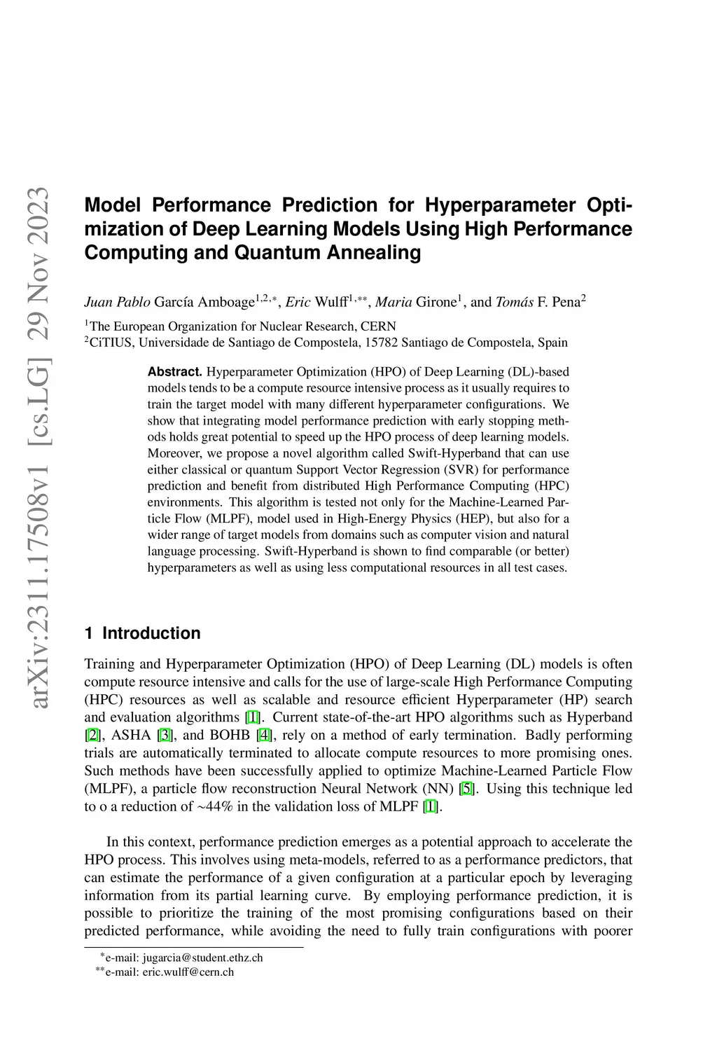 Hyperparameter Optimization (HPO) of Deep Learning-based models tends to be a compute resource intensive process as it usually requires to train the target model with many different hyperparameter configurations. We show that integrating model performance prediction with early stopping methods holds great potential to speed up the HPO process of deep learning models. Moreover, we propose a novel algorithm called Swift-Hyperband that can use either classical or quantum support vector regression for performance prediction and benefit from distributed High Performance Computing environments. This algorithm is tested not only for the Machine-Learned Particle Flow model used in High Energy Physics, but also for a wider range of target models from domains such as computer vision and natural language processing. Swift-Hyperband is shown to find comparable (or better) hyperparameters as well as using less computational resources in all test cases.