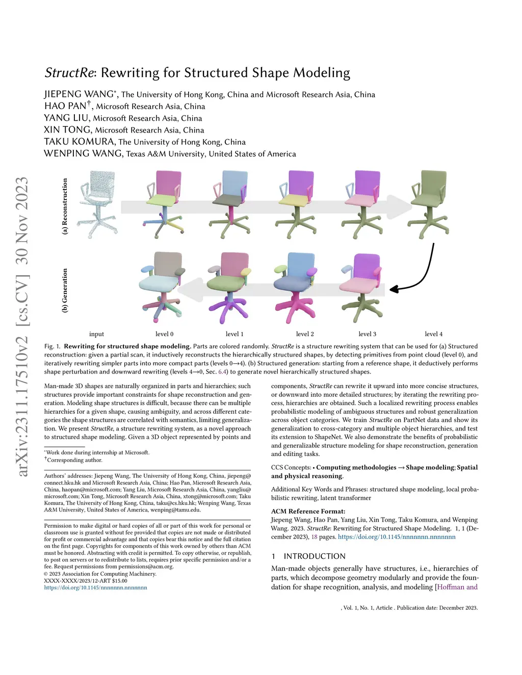 Man-made 3D shapes are naturally organized in parts and hierarchies; such structures provide important constraints for shape reconstruction and generation. Modeling shape structures is difficult, because there can be multiple hierarchies for a given shape, causing ambiguity, and across different categories the shape structures are correlated with semantics, limiting generalization. We present StructRe, a structure rewriting system, as a novel approach to structured shape modeling. Given a 3D object represented by points and components, StructRe can rewrite it upward into more concise structures, or downward into more detailed structures; by iterating the rewriting process, hierarchies are obtained. Such a localized rewriting process enables probabilistic modeling of ambiguous structures and robust generalization across object categories. We train StructRe on PartNet data and show its generalization to cross-category and multiple object hierarchies, and test its extension to ShapeNet. We also demonstrate the benefits of probabilistic and generalizable structure modeling for shape reconstruction, generation and editing tasks.