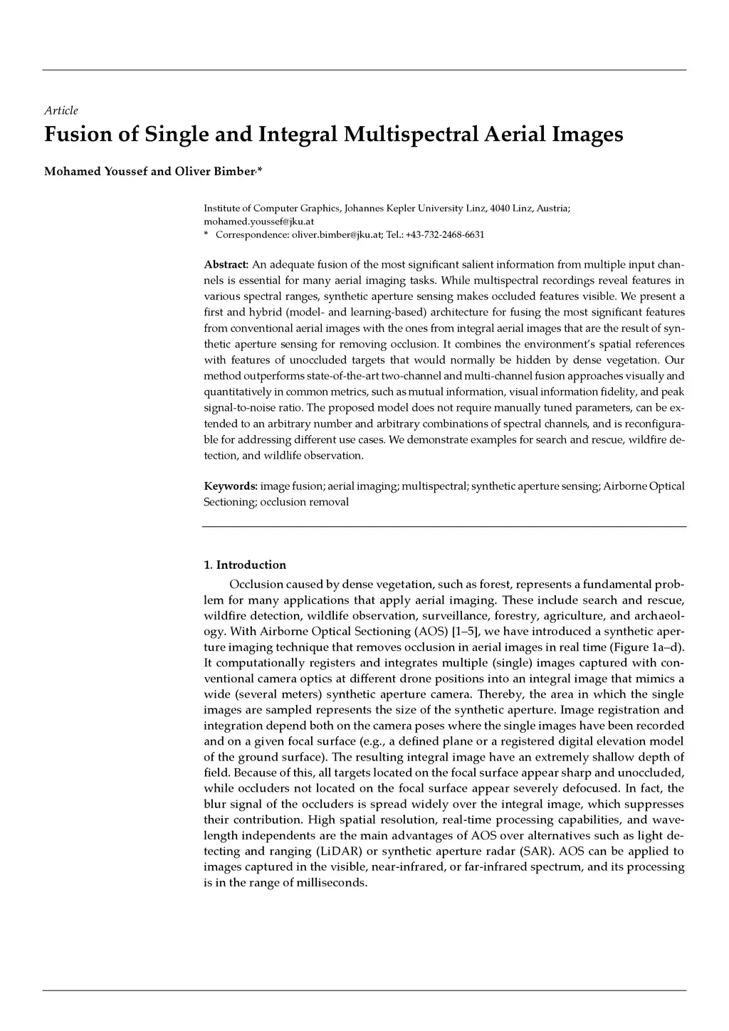An adequate fusion of the most significant salient information from multiple input channels is essential for many aerial imaging tasks. While multispectral recordings reveal features in various spectral ranges, synthetic aperture sensing makes occluded features visible. We present a first and hybrid (model- and learning-based) architecture for fusing the most significant features from conventional aerial images with the ones from integral aerial images that are the result of synthetic aperture sensing for removing occlusion. It combines the environment's spatial references with features of unoccluded targets that would normally be hidden by dense vegetation. Our method outperforms state-of-the-art two-channel and multi-channel fusion approaches visually and quantitatively in common metrics, such as mutual information, visual information fidelity, and peak signal-to-noise ratio. The proposed model does not require manually tuned parameters, can be extended to an arbitrary number and arbitrary combinations of spectral channels, and is reconfigurable for addressing different use cases. We demonstrate examples for search and rescue, wildfire detection, and wildlife observation.