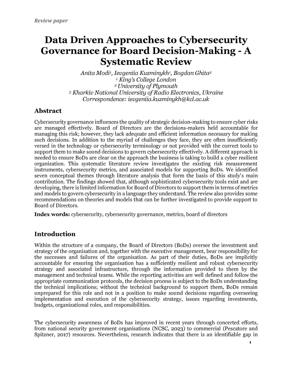 Cybersecurity governance influences the quality of strategic decision-making to ensure cyber risks are managed effectively. Board of Directors are the decisions-makers held accountable for managing this risk; however, they lack adequate and efficient information necessary for making such decisions. In addition to the myriad of challenges they face, they are often insufficiently versed in the technology or cybersecurity terminology or not provided with the correct tools to support them to make sound decisions to govern cybersecurity effectively. A different approach is needed to ensure BoDs are clear on the approach the business is taking to build a cyber resilient organization. This systematic literature review investigates the existing risk measurement instruments, cybersecurity metrics, and associated models for supporting BoDs. We identified seven conceptual themes through literature analysis that form the basis of this study's main contribution. The findings showed that, although sophisticated cybersecurity tools exist and are developing, there is limited information for Board of Directors to support them in terms of metrics and models to govern cybersecurity in a language they understand. The review also provides some recommendations on theories and models that can be further investigated to provide support to Board of Directors.