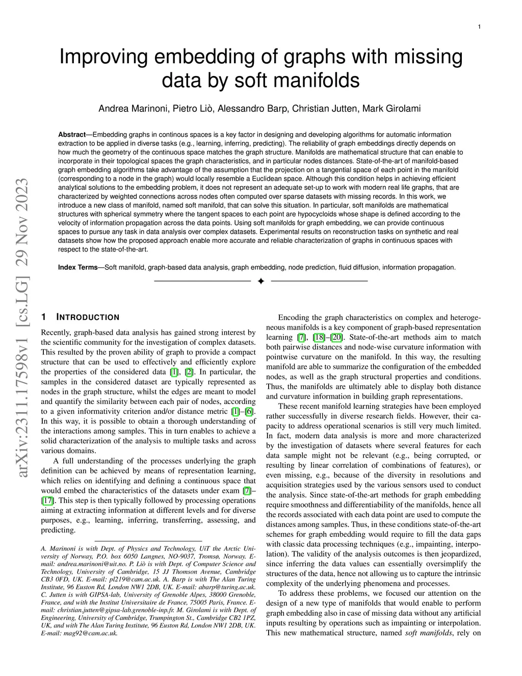 Improving embedding of graphs with missing data by soft manifolds