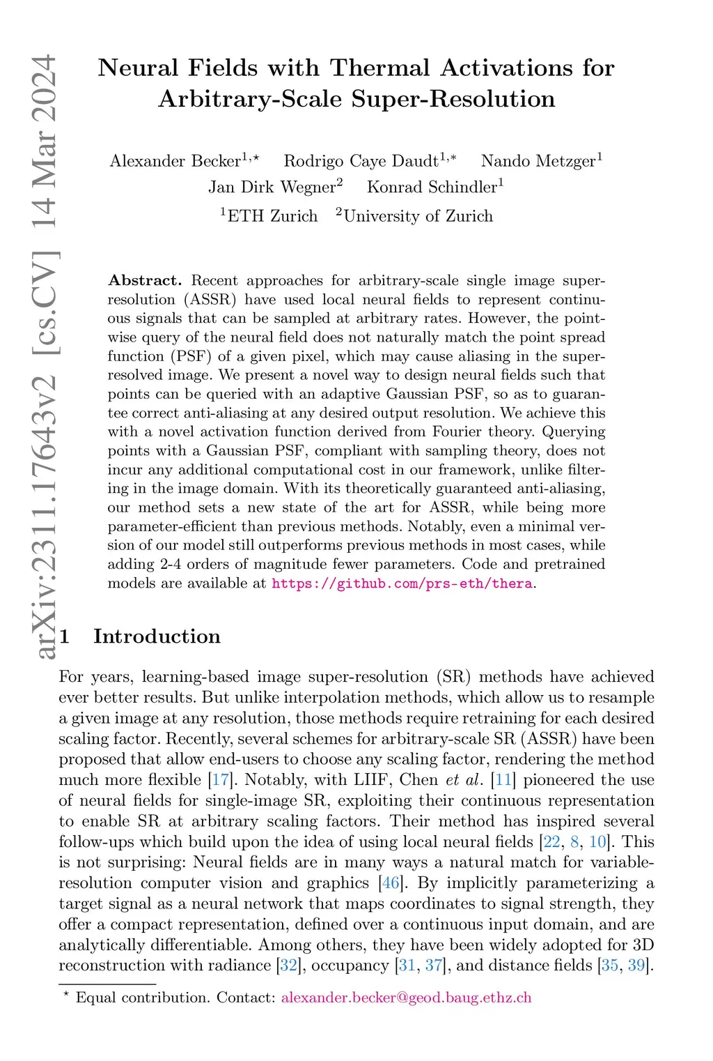 Recent approaches to arbitrary-scale single image super-resolution (ASR) use neural fields to represent continuous signals that can be sampled at arbitrary resolutions. However, point-wise queries of neural fields do not naturally match the point spread function (PSF) of pixels, which may cause aliasing in the super-resolved image. Existing methods attempt to mitigate this by approximating an integral version of the field at each scaling factor, compromising both fidelity and generalization. In this work, we introduce neural heat fields, a novel neural field formulation that inherently models a physically exact PSF. Our formulation enables analytically correct anti-aliasing at any desired output resolution, and -- unlike supersampling -- at no additional cost. Building on this foundation, we propose Thera, an end-to-end ASR method that substantially outperforms existing approaches, while being more parameter-efficient and offering strong theoretical guarantees. The project page is atthis https URL.