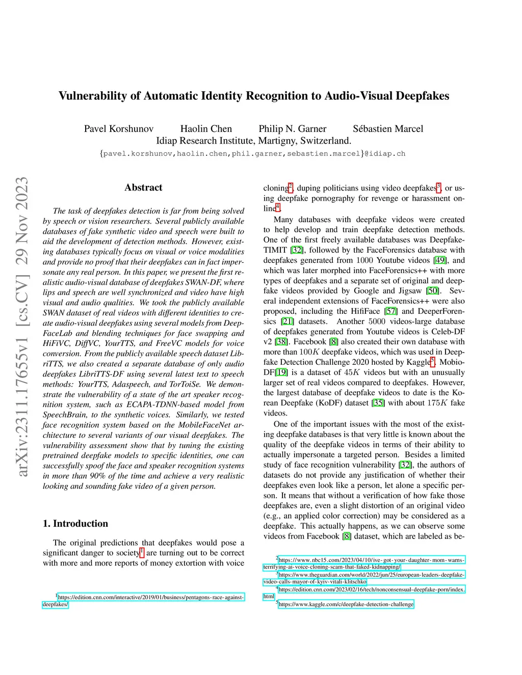 The task of deepfakes detection is far from being solved by speech or vision researchers. Several publicly available databases of fake synthetic video and speech were built to aid the development of detection methods. However, existing databases typically focus on visual or voice modalities and provide no proof that their deepfakes can in fact impersonate any real person. In this paper, we present the first realistic audio-visual database of deepfakes SWAN-DF, where lips and speech are well synchronized and video have high visual and audio qualities. We took the publicly available SWAN dataset of real videos with different identities to create audio-visual deepfakes using several models from DeepFaceLab and blending techniques for face swapping and HiFiVC, DiffVC, YourTTS, and FreeVC models for voice conversion. From the publicly available speech dataset LibriTTS, we also created a separate database of only audio deepfakes LibriTTS-DF using several latest text to speech methods: YourTTS, Adaspeech, and TorToiSe. We demonstrate the vulnerability of a state of the art speaker recognition system, such as ECAPA-TDNN-based model from SpeechBrain, to the synthetic voices. Similarly, we tested face recognition system based on the MobileFaceNet architecture to several variants of our visual deepfakes. The vulnerability assessment show that by tuning the existing pretrained deepfake models to specific identities, one can successfully spoof the face and speaker recognition systems in more than 90% of the time and achieve a very realistic looking and sounding fake video of a given person.