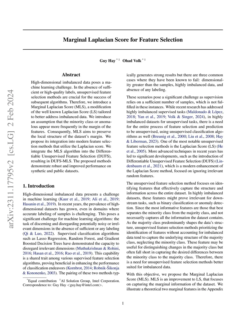 High-dimensional imbalanced data poses a machine learning challenge. In the absence of sufficient or high-quality labels, unsupervised feature selection methods are crucial for the success of subsequent algorithms. Therefore, we introduce a Marginal Laplacian Score (MLS), a modification of the well known Laplacian Score (LS) tailored to better address imbalanced data. We introduce an assumption that the minority class or anomalous appear more frequently in the margin of the features. Consequently, MLS aims to preserve the local structure of the dataset's margin. We propose its integration into modern feature selection methods that utilize the Laplacian score. We integrate the MLS algorithm into the Differentiable Unsupervised Feature Selection (DUFS), resulting in DUFS-MLS. The proposed methods demonstrate robust and improved performance on synthetic and public datasets.