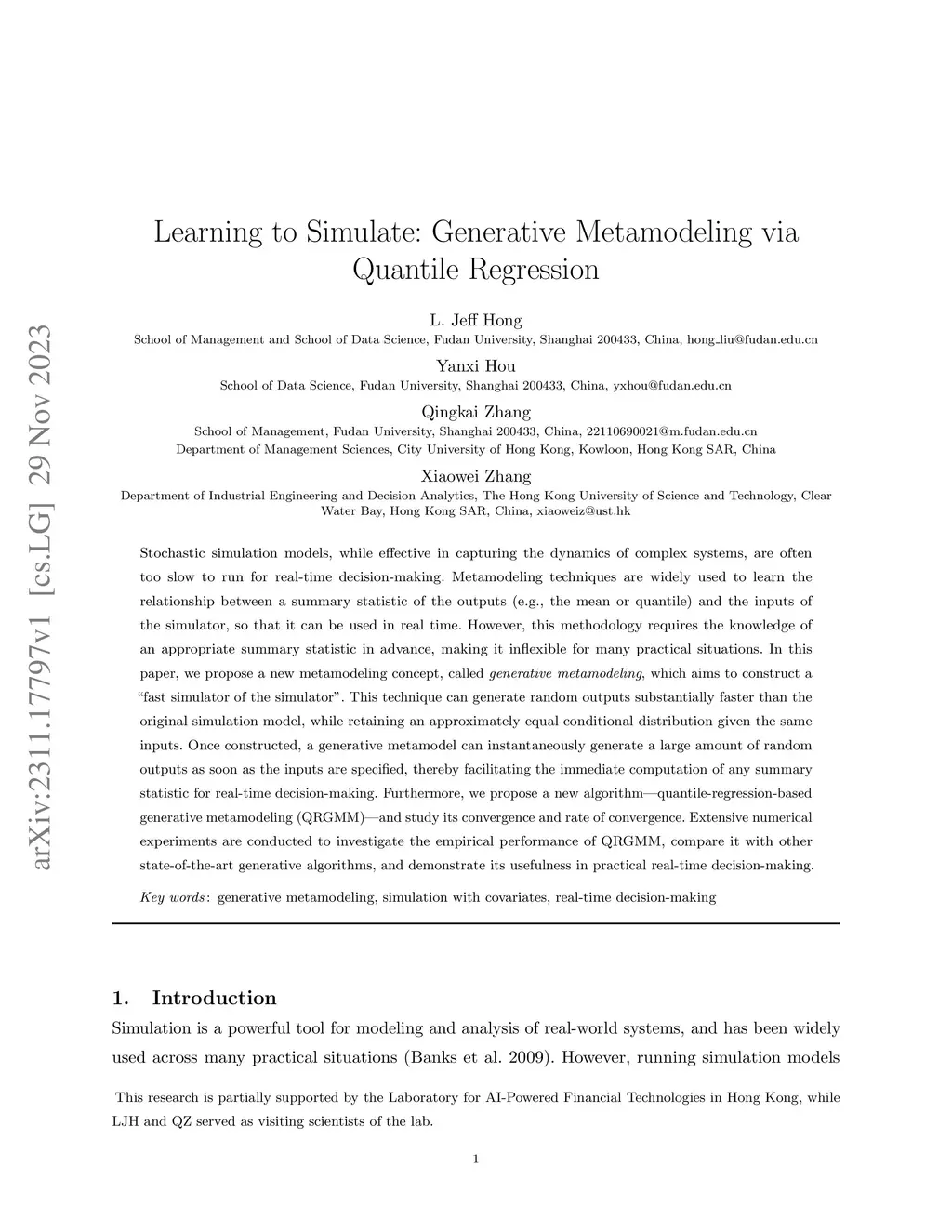 Stochastic simulation models effectively capture complex system dynamics but are often too slow for real-time decision-making. Traditional metamodeling techniques learn relationships between simulator inputs and a single output summary statistic, such as the mean or median. These techniques enable real-time predictions without additional simulations. However, they require prior selection of one appropriate output summary statistic, limiting their flexibility in practical applications. We propose a new concept: generative metamodeling. It aims to construct a "fast simulator of the simulator," generating random outputs significantly faster than the original simulator while preserving approximately equal conditional distributions. Generative metamodels enable rapid generation of numerous random outputs upon input specification, facilitating immediate computation of any summary statistic for real-time decision-making. We introduce a new algorithm, quantile-regression-based generative metamodeling (QRGMM), and establish its distributional convergence and convergence rate. Extensive numerical experiments demonstrate QRGMM's efficacy compared to other state-of-the-art generative algorithms in practical real-time decision-making scenarios.
