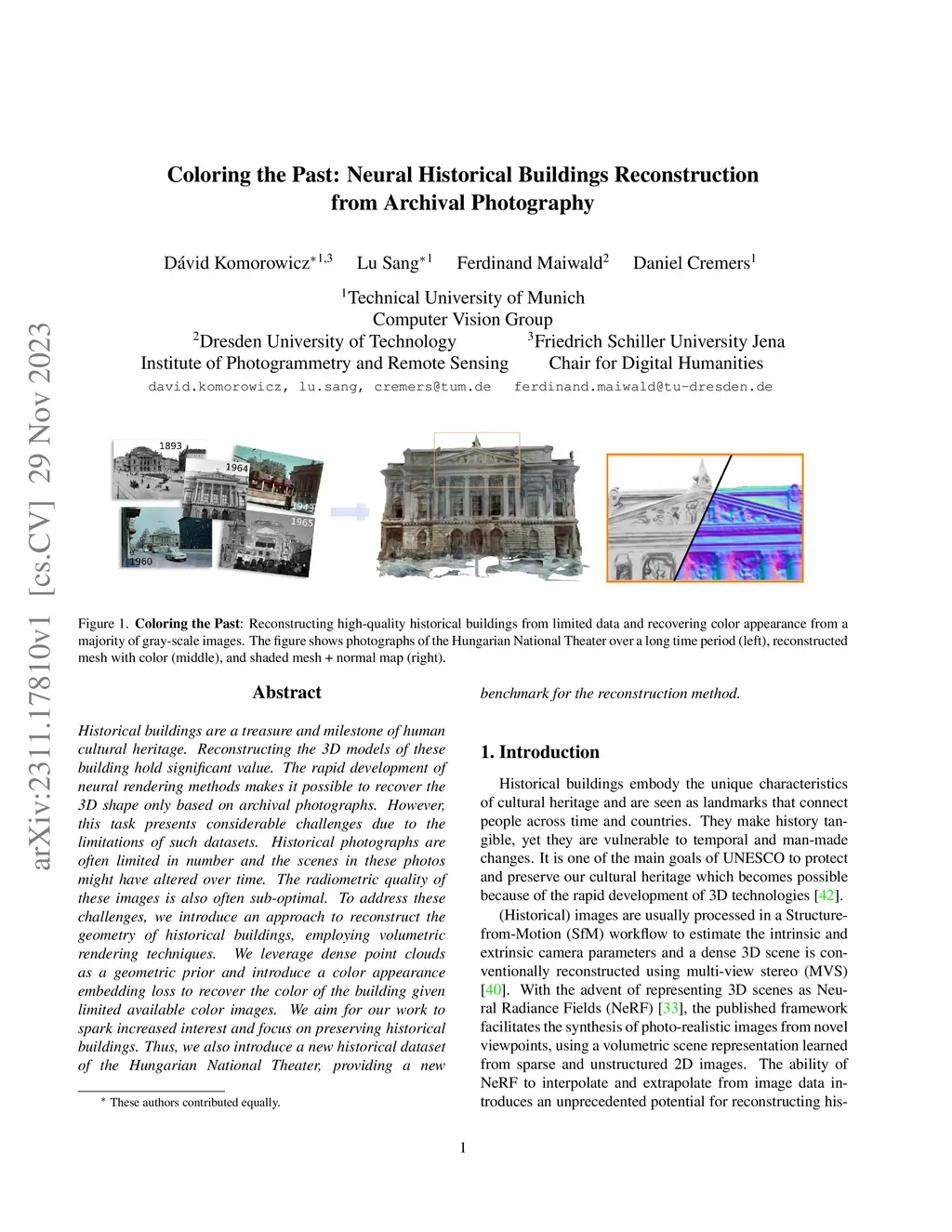 Historical buildings are a treasure and milestone of human cultural heritage. Reconstructing the 3D models of these building hold significant value. The rapid development of neural rendering methods makes it possible to recover the 3D shape only based on archival photographs. However, this task presents considerable challenges due to the limitations of such datasets. Historical photographs are often limited in number and the scenes in these photos might have altered over time. The radiometric quality of these images is also often sub-optimal. To address these challenges, we introduce an approach to reconstruct the geometry of historical buildings, employing volumetric rendering techniques. We leverage dense point clouds as a geometric prior and introduce a color appearance embedding loss to recover the color of the building given limited available color images. We aim for our work to spark increased interest and focus on preserving historical buildings. Thus, we also introduce a new historical dataset of the Hungarian National Theater, providing a new benchmark for the reconstruction method.