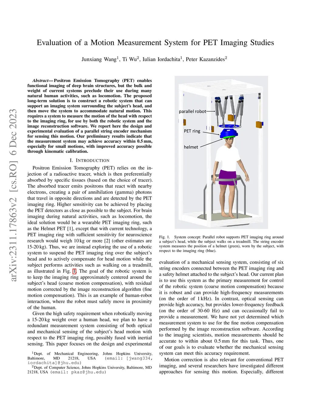 Positron Emission Tomography (PET) enables functional imaging of deep brain structures, but the bulk and weight of current systems preclude their use during many natural human activities, such as locomotion. The proposed long-term solution is to construct a robotic system that can support an imaging system surrounding the subject's head, and then move the system to accommodate natural motion. This requires a system to measure the motion of the head with respect to the imaging ring, for use by both the robotic system and the image reconstruction software. We report here the design and experimental evaluation of a parallel string encoder mechanism for sensing this motion. Our preliminary results indicate that the measurement system may achieve accuracy within 0.5 mm, especially for small motions, with improved accuracy possible through kinematic calibration.